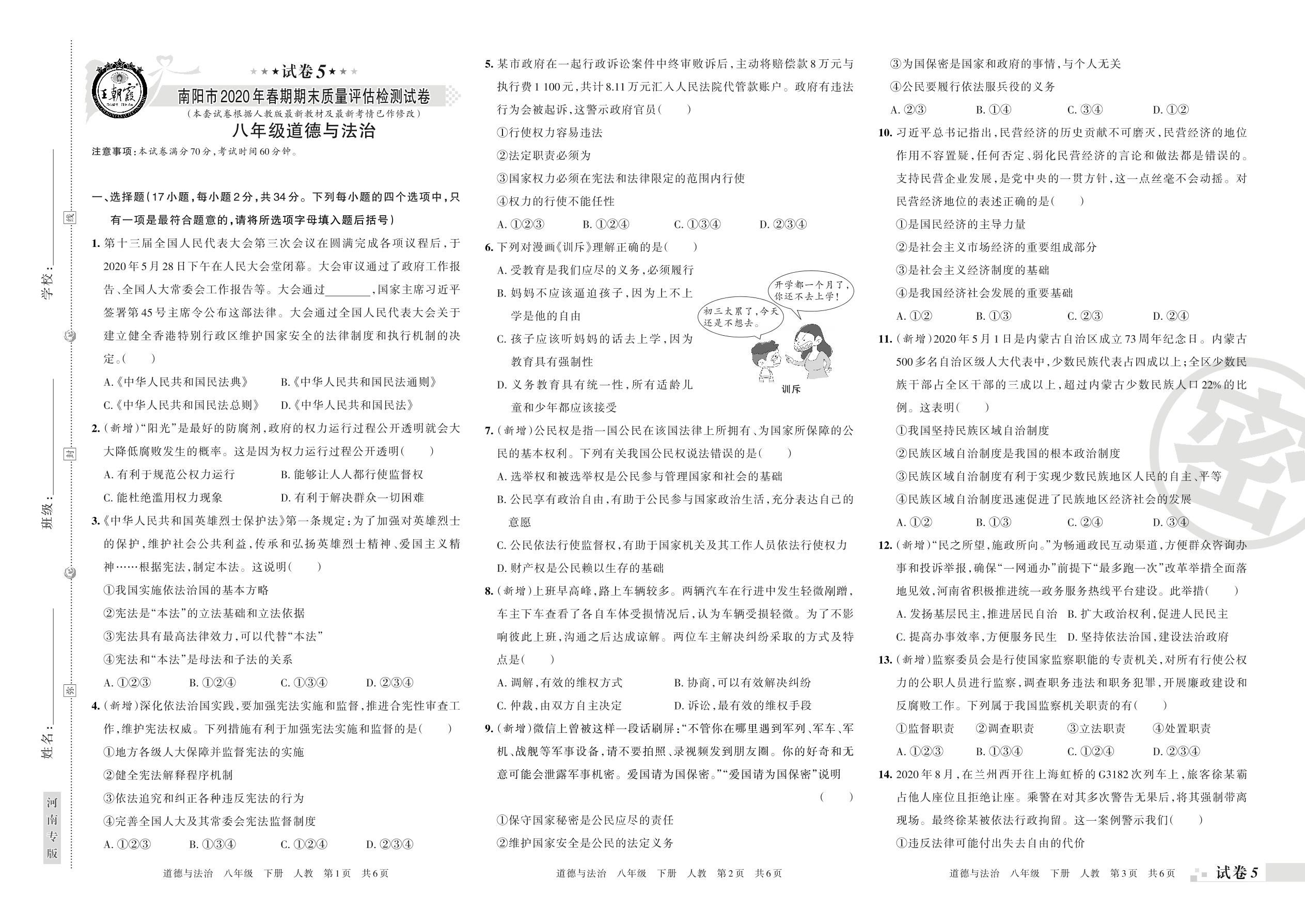 2019-2020学年第二学期南阳市八年级道德与法治试卷(人教版)【5】