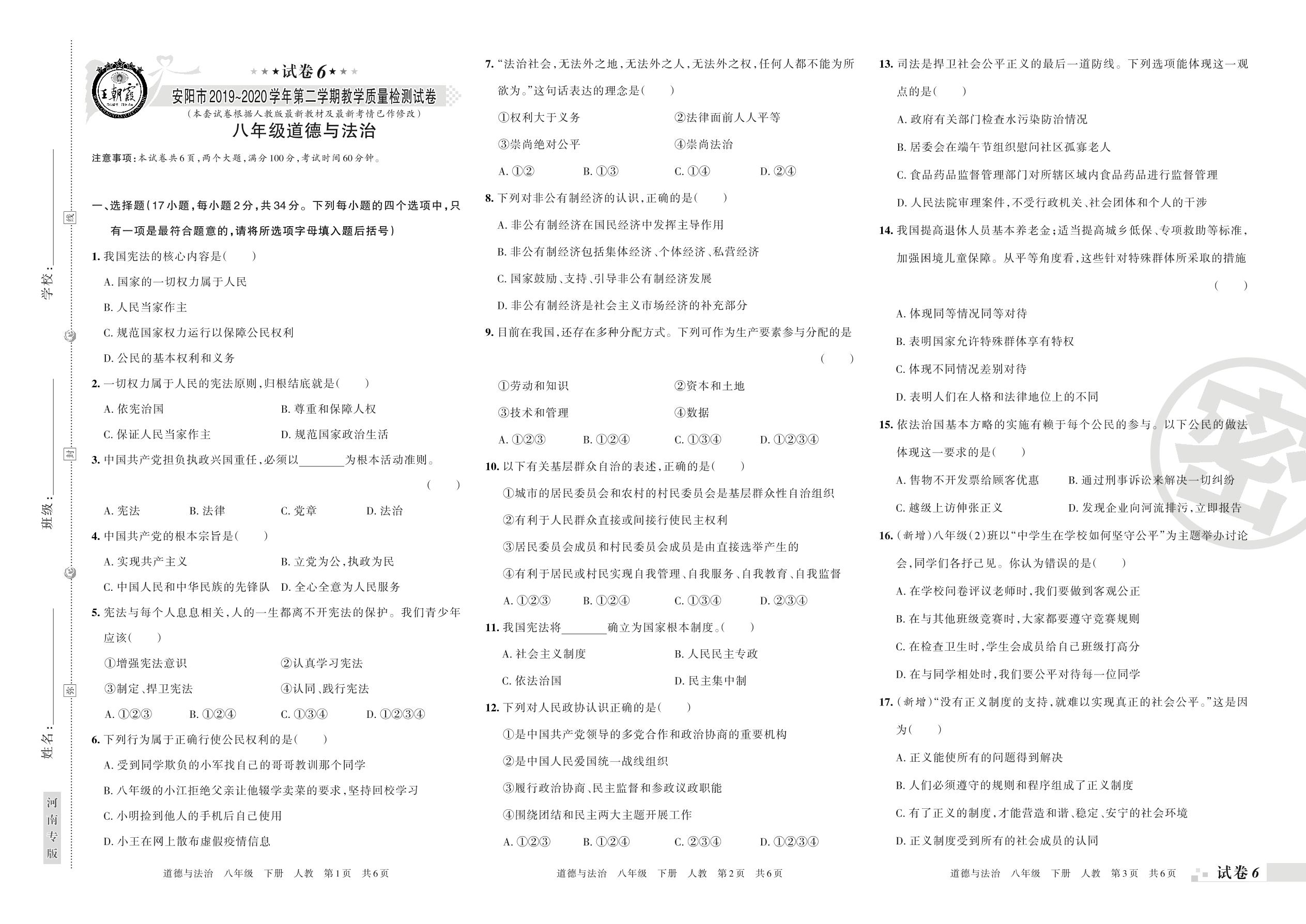 2019-2020学年第二学期安阳市八年级道德与法治试卷(人教版)【6】