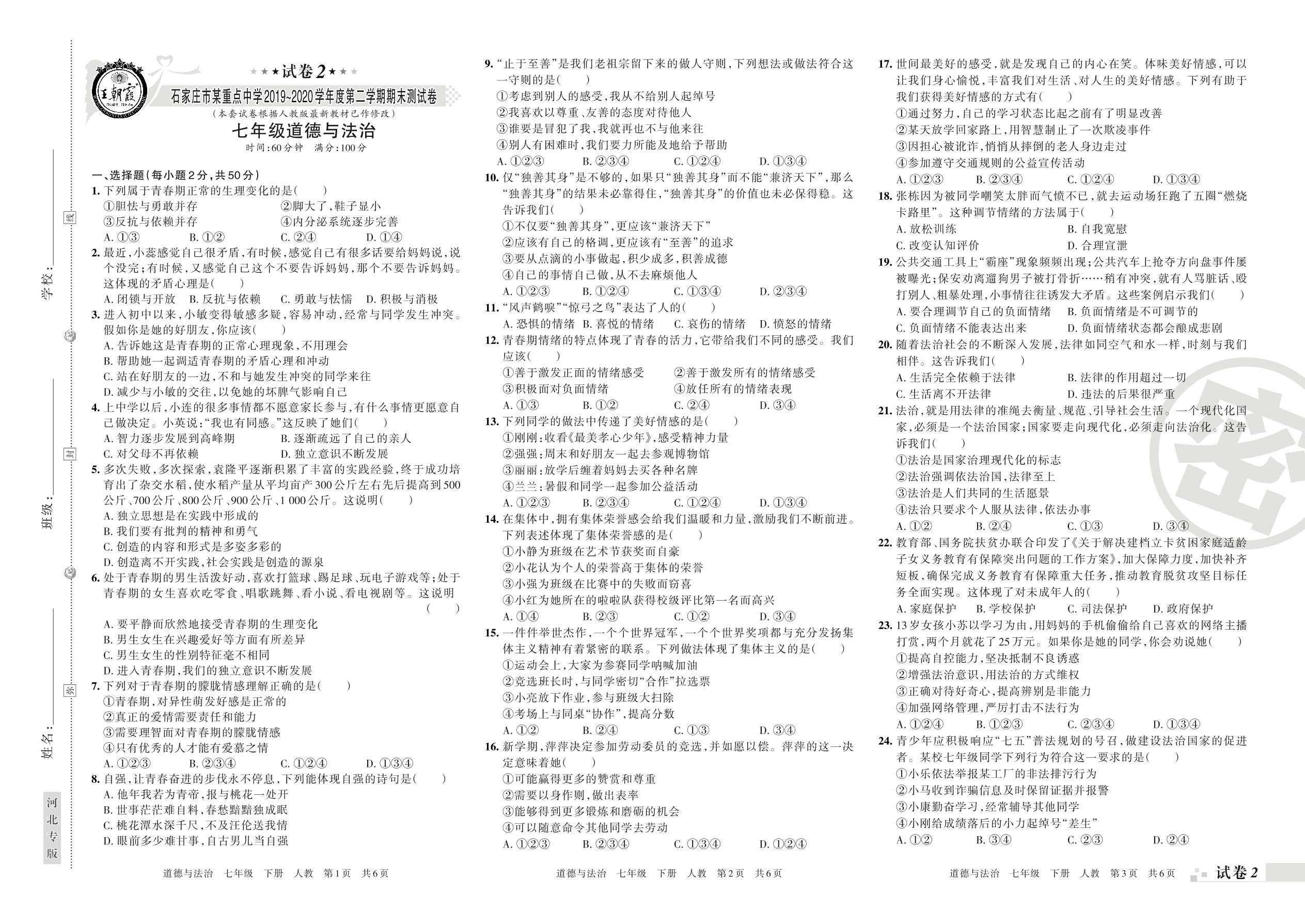 2019-2020学年第二学期石家庄市重点中学七年级道德与法治试卷(人教版)【2】