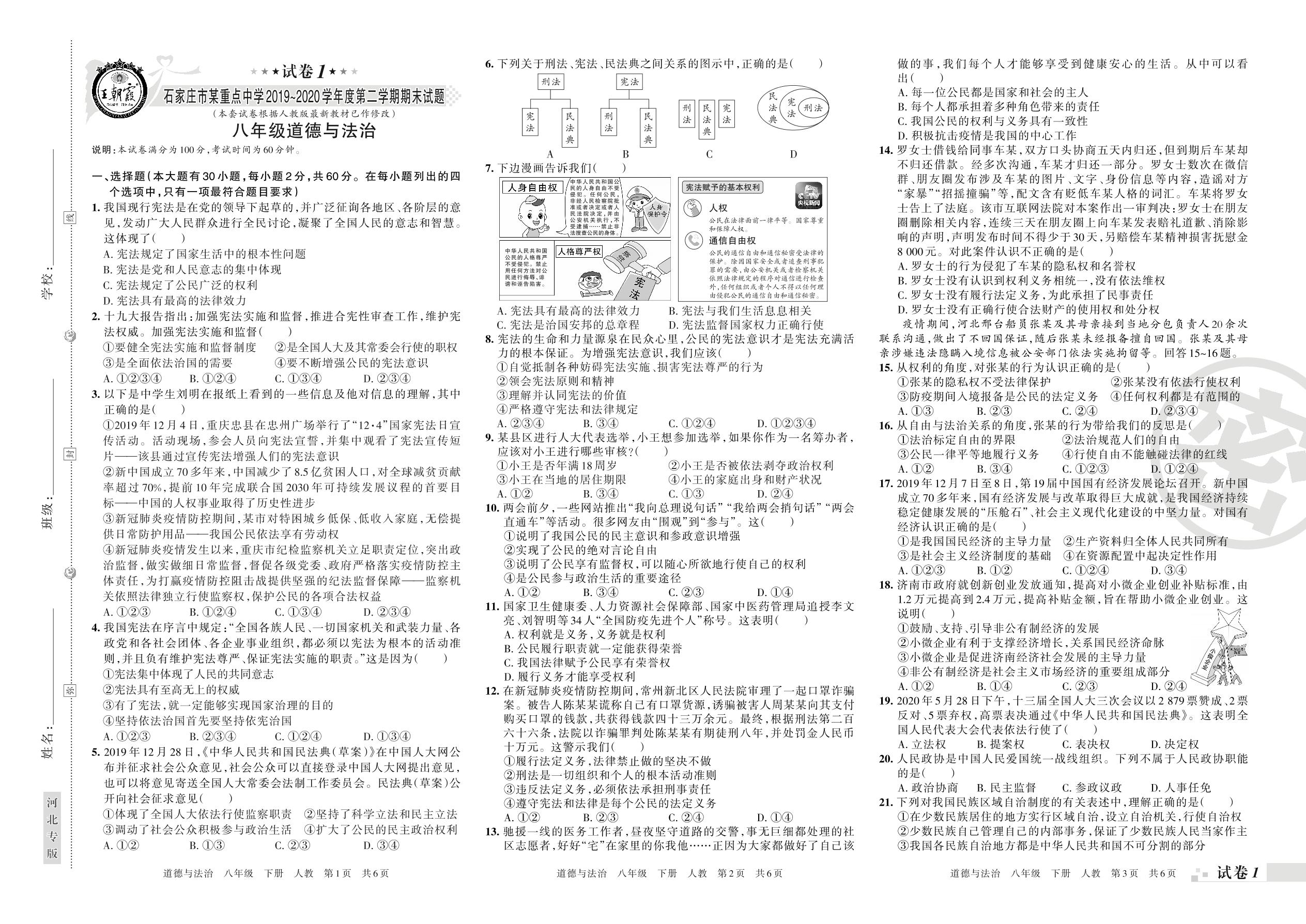 2019-2020学年第二学期石家庄市某重点中学八年级道德与法治试卷(人教版)【1】