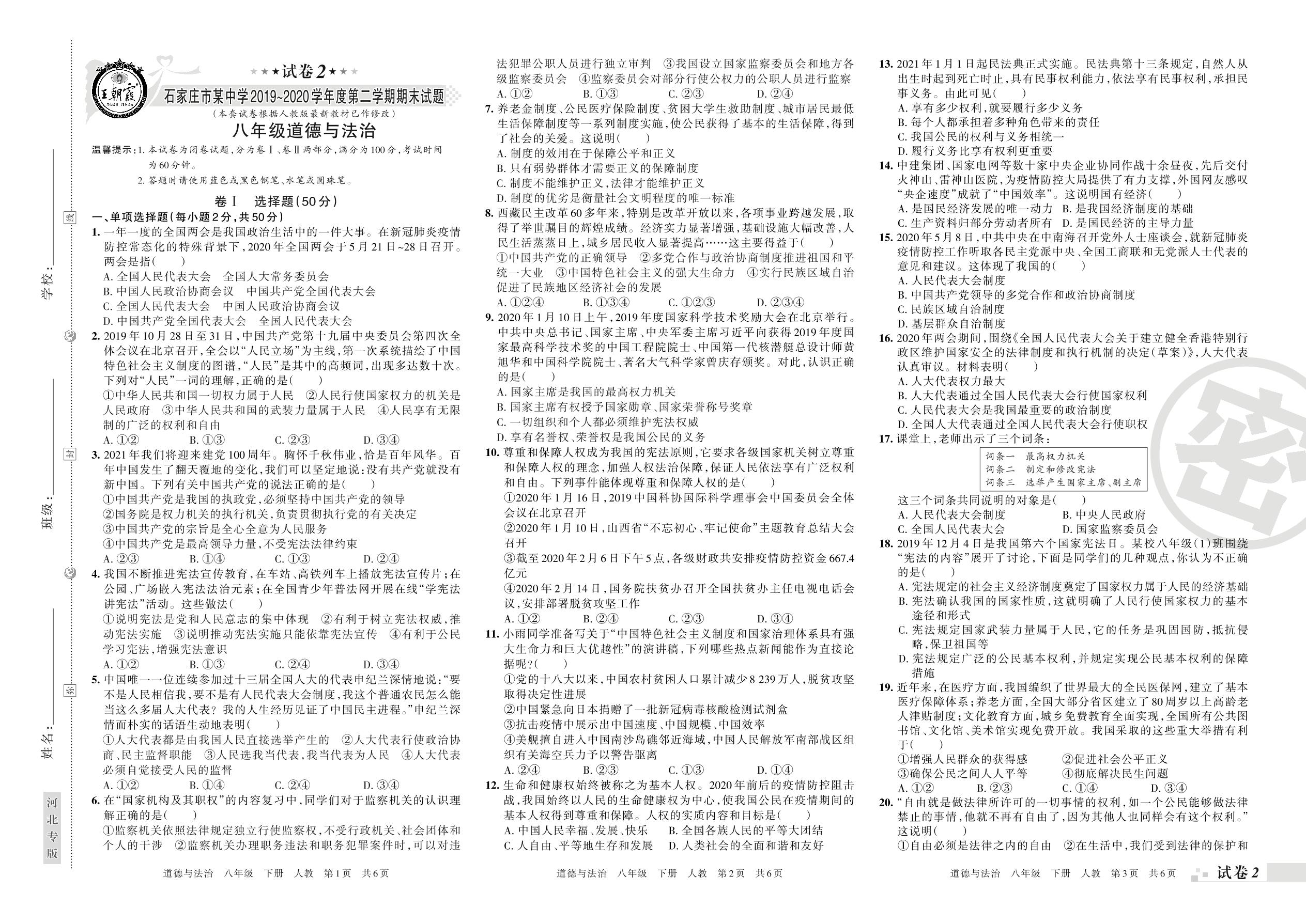 2019-2020学年第二学期石家庄市某中学八年级道德与法治试卷(人教版)【2】