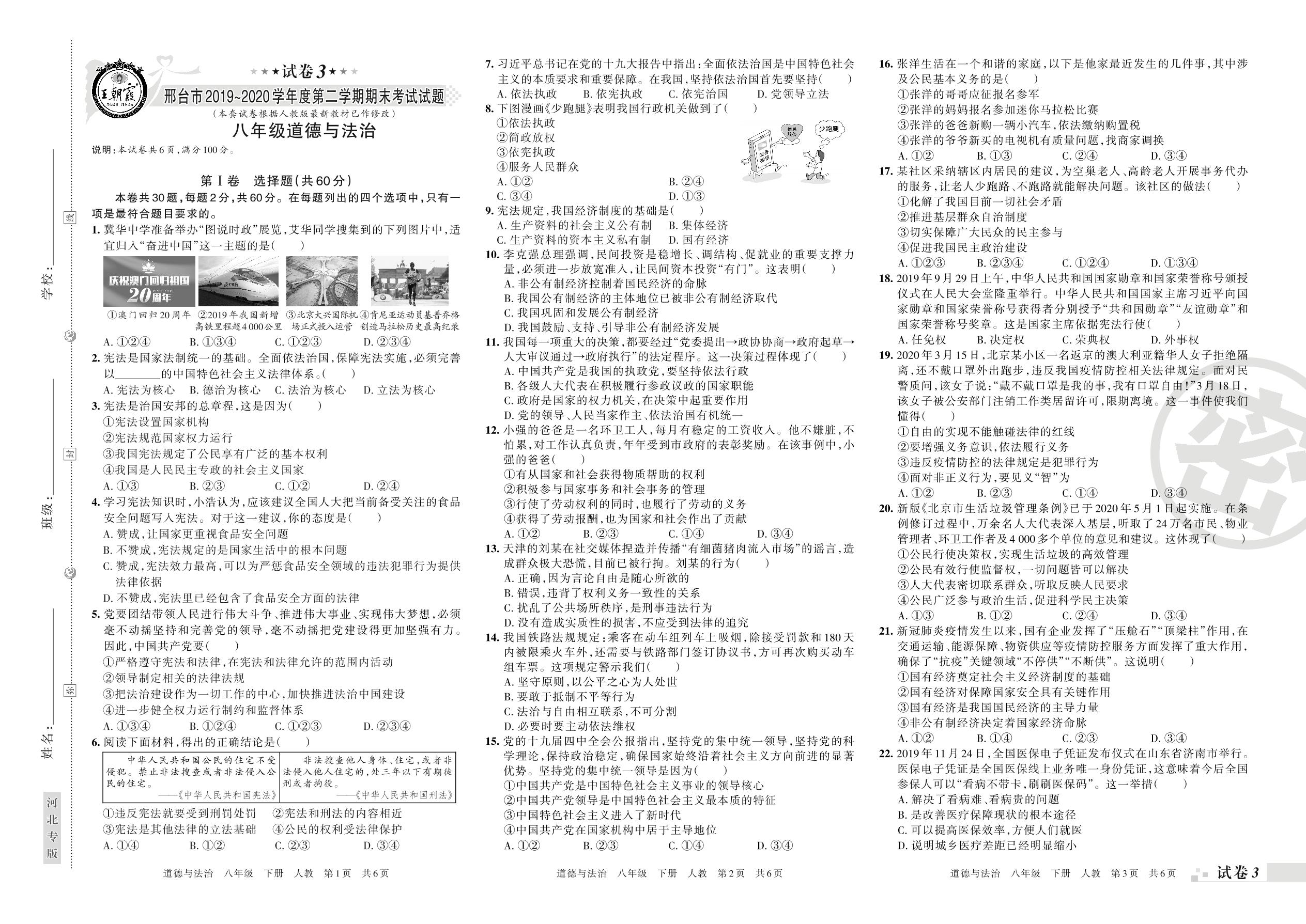 2019-2020学年第二学期邢台市八年级道德与法治试卷(人教版)【3】