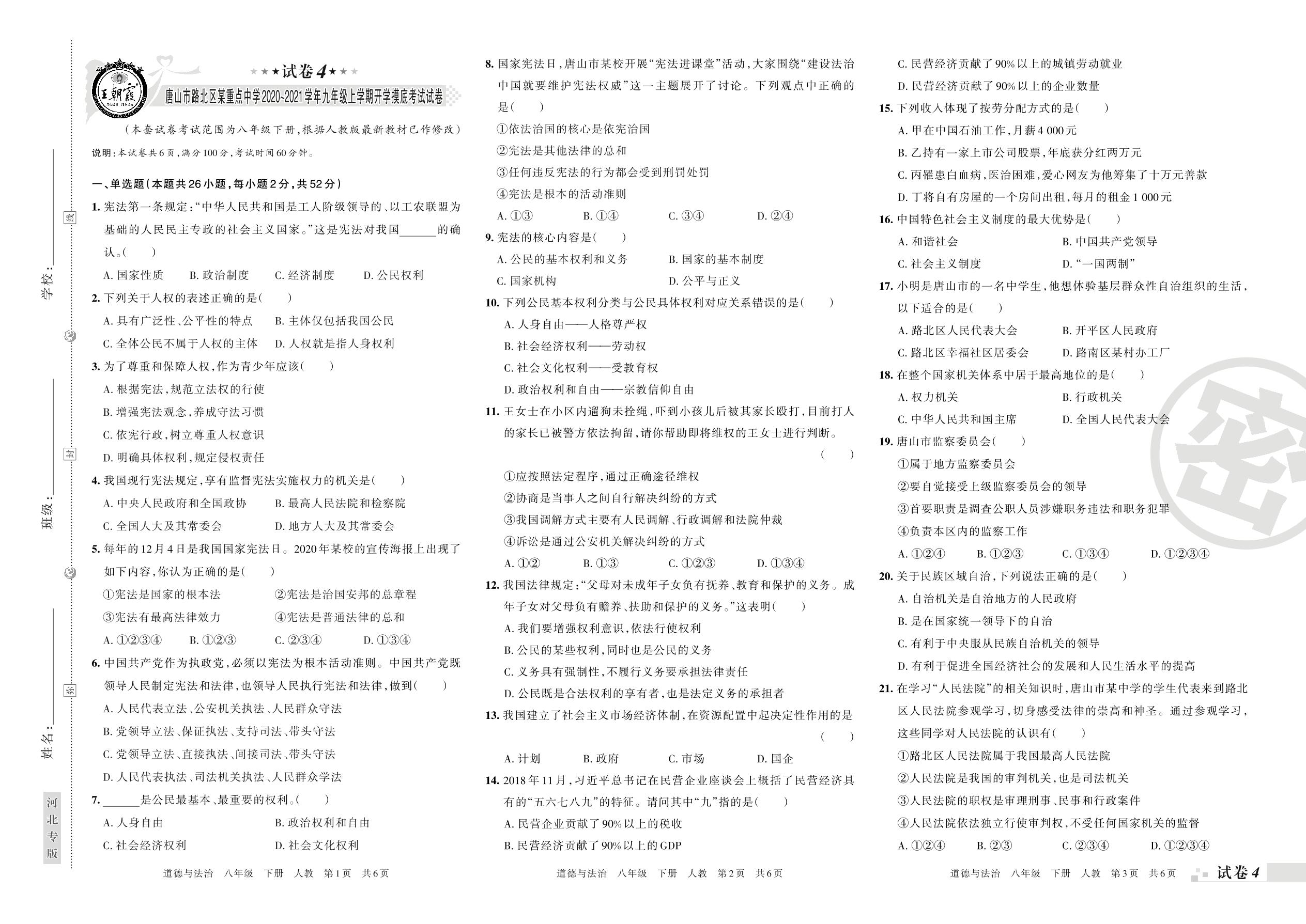 2019-2020学年第二学期唐山市路北区八年级道德与法治试卷(人教版)【4】