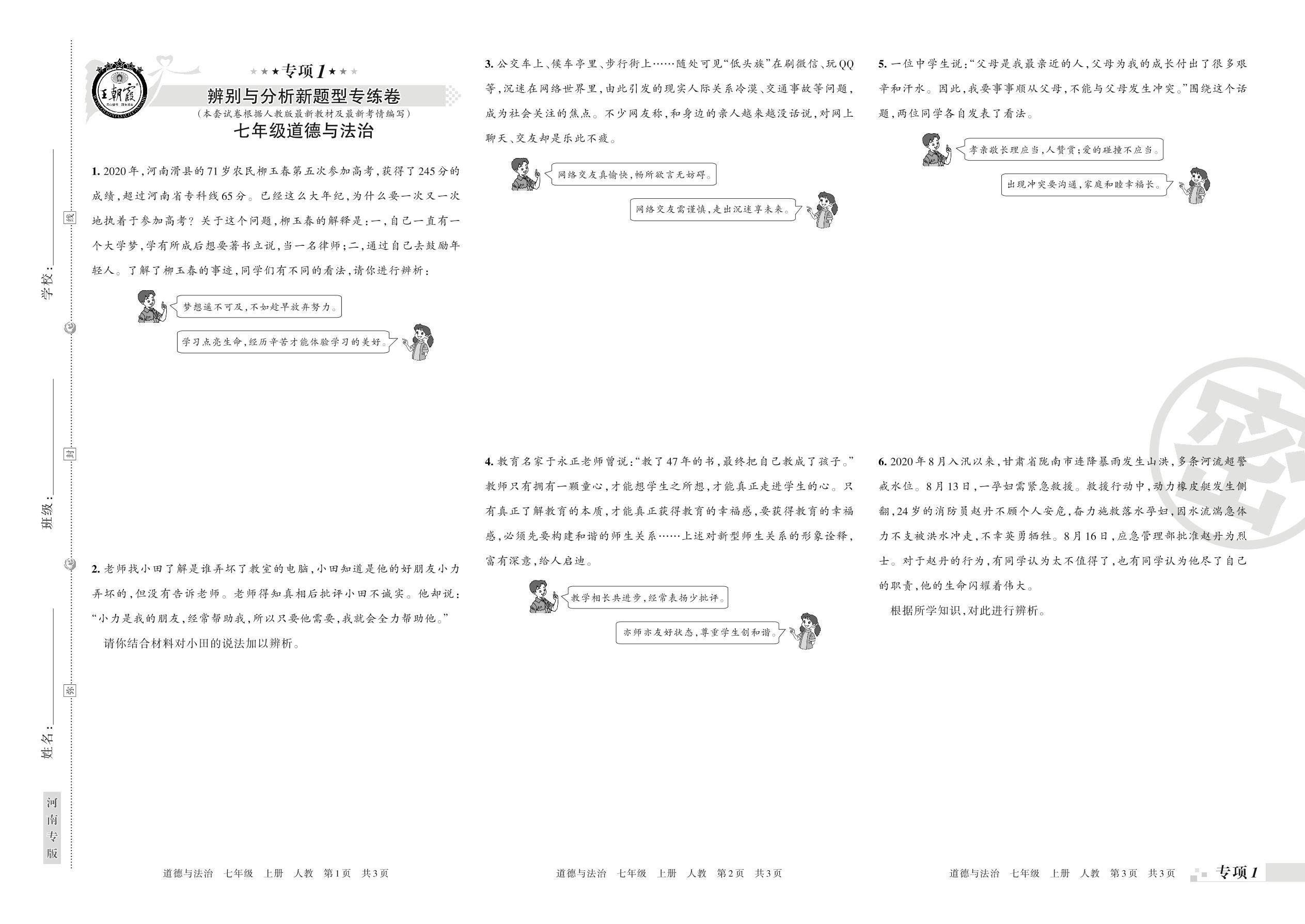 王朝霞期末专项卷——辨别与分析、活动与探索新题型专练七年级上册道德与法治(人教版)【0】