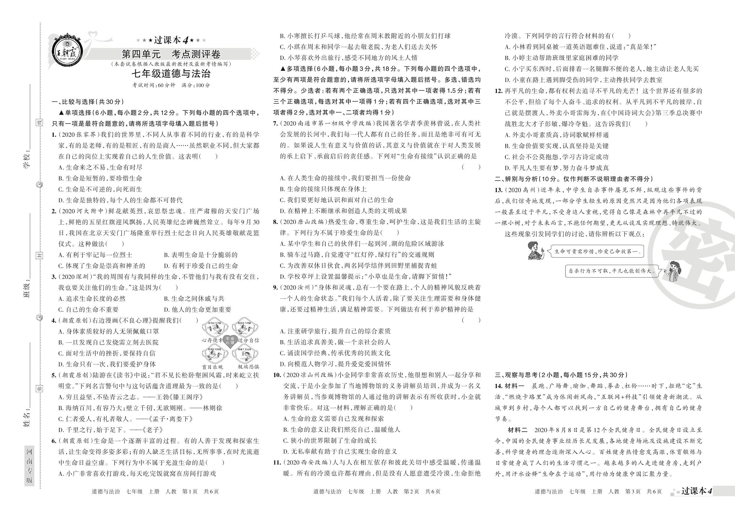 王朝霞期末过课本——第四单元考点测评七年级上册道德与法治(人教版)_R210812135738【0】
