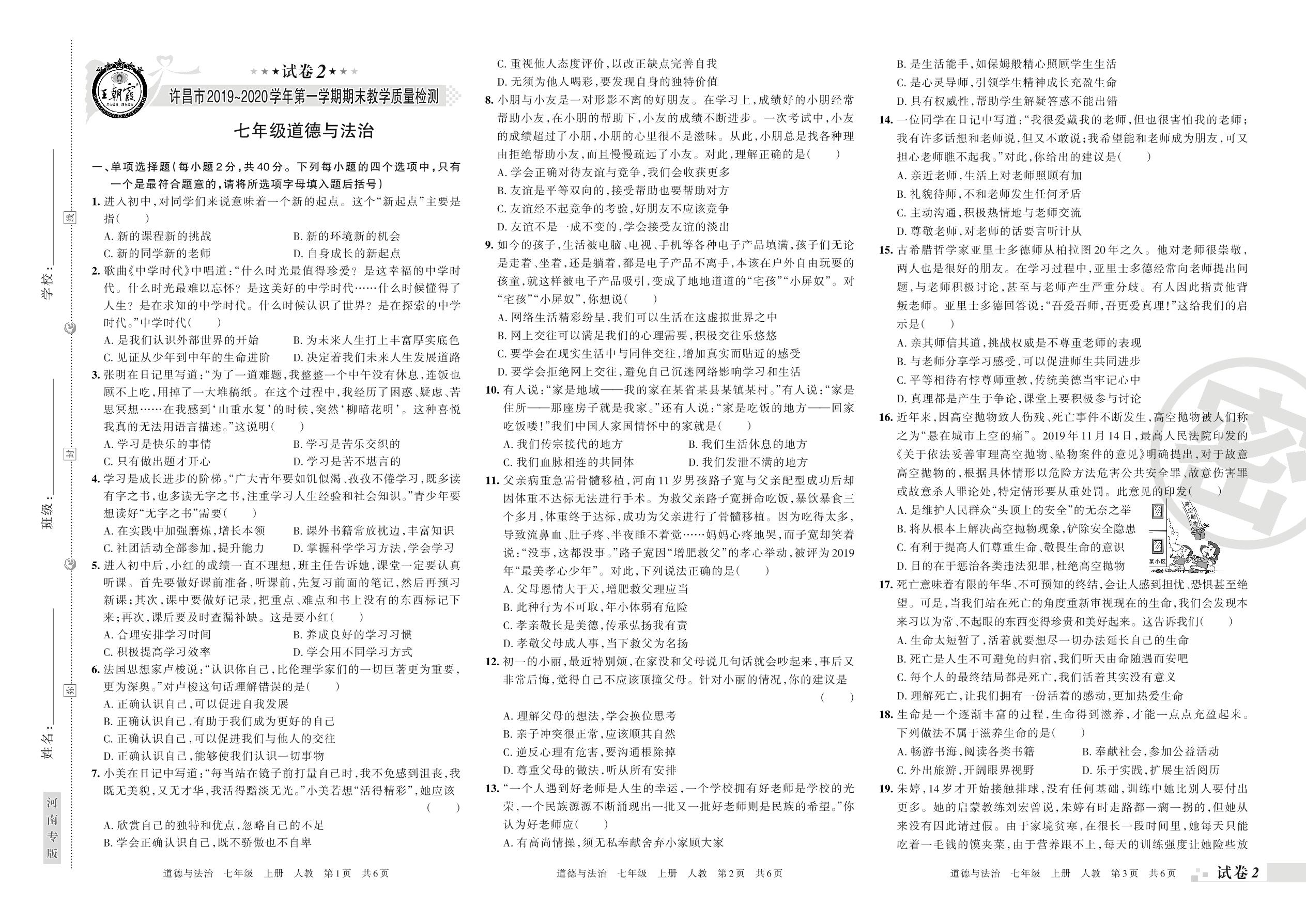 2019-2020学年第一学期许昌市七年级道德与法治试卷(人教版)【2】