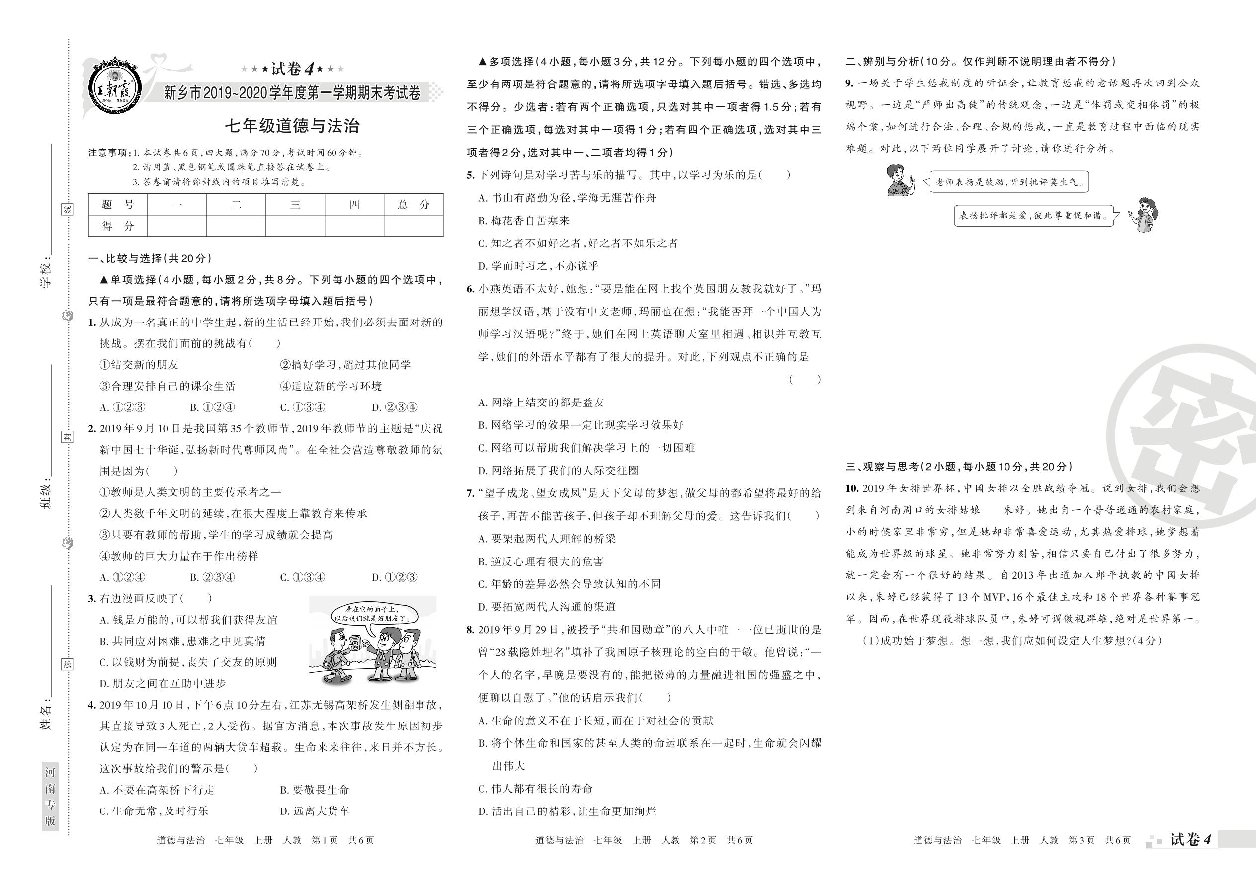 2019-2020学年第一学期新乡市七年级道德与法治试卷(人教版)【4】