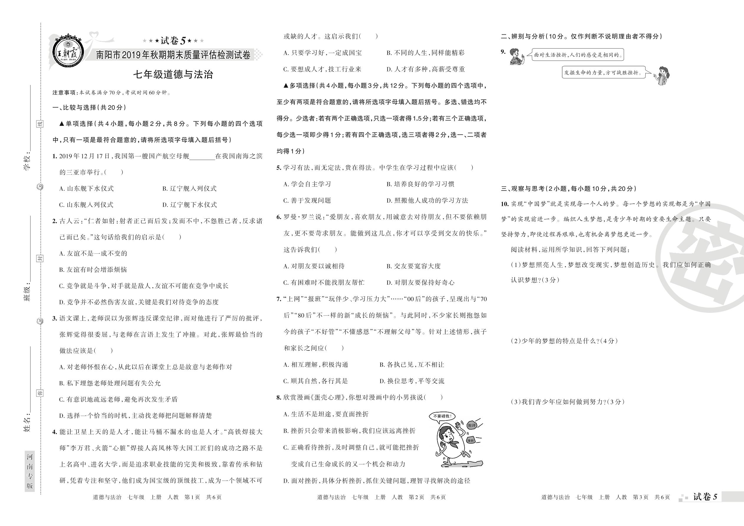 2019-2020学年第一学期南阳市七年级道德与法治试卷(人教版)【5】