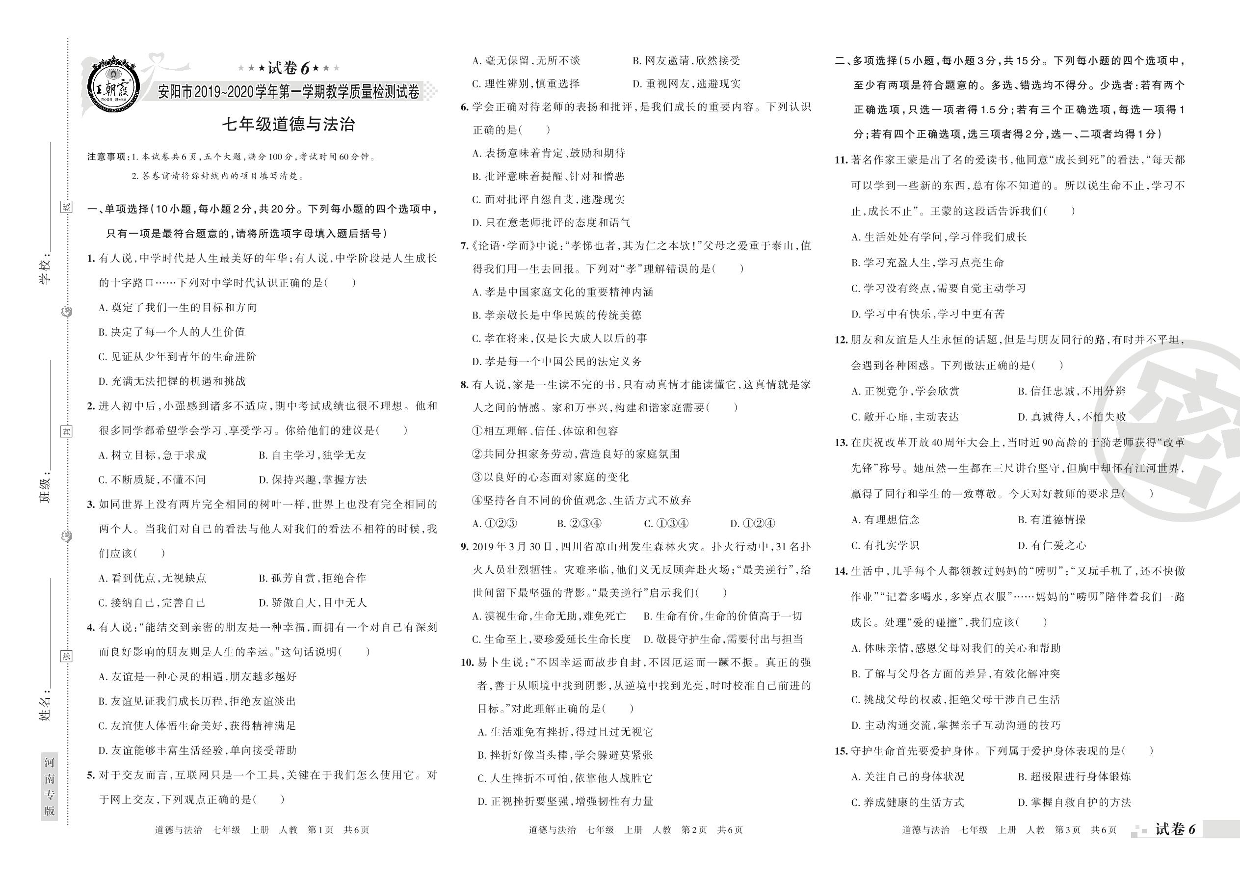 2019-2020学年第一学期安阳市七年级道德与法治试卷(人教版)【6】