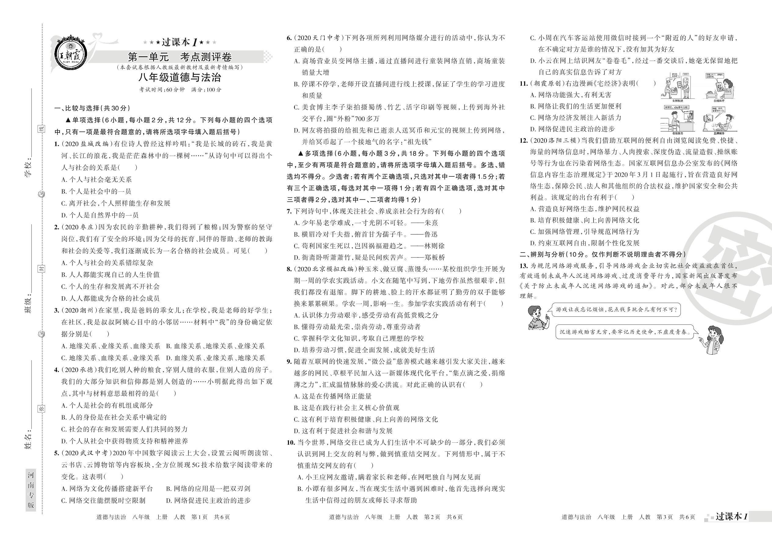 王朝霞期末过课本——第一单元考点测评八年级上册道德与法治(人教版)_R210812140059【0】