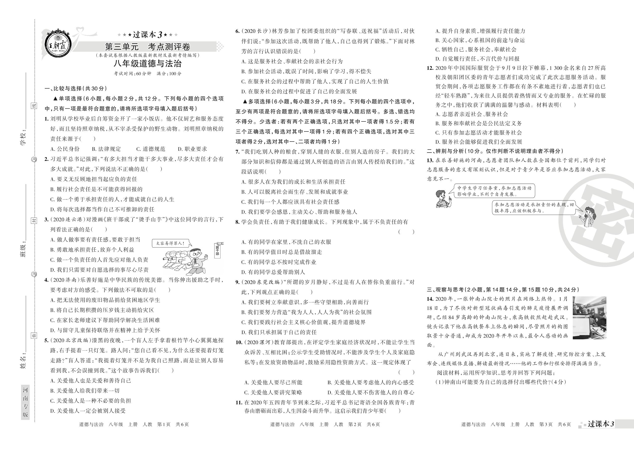 王朝霞期末过课本——第三单元考点测评八年级上册道德与法治(人教版)_R210812140136【0】