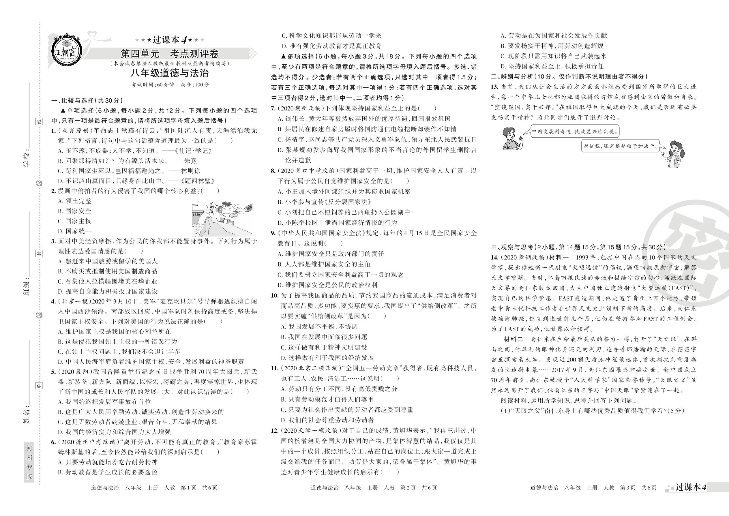 王朝霞期末过课本——第四单元考点测评八年级上册道德与法治(人教版)_R210812140154【0】
