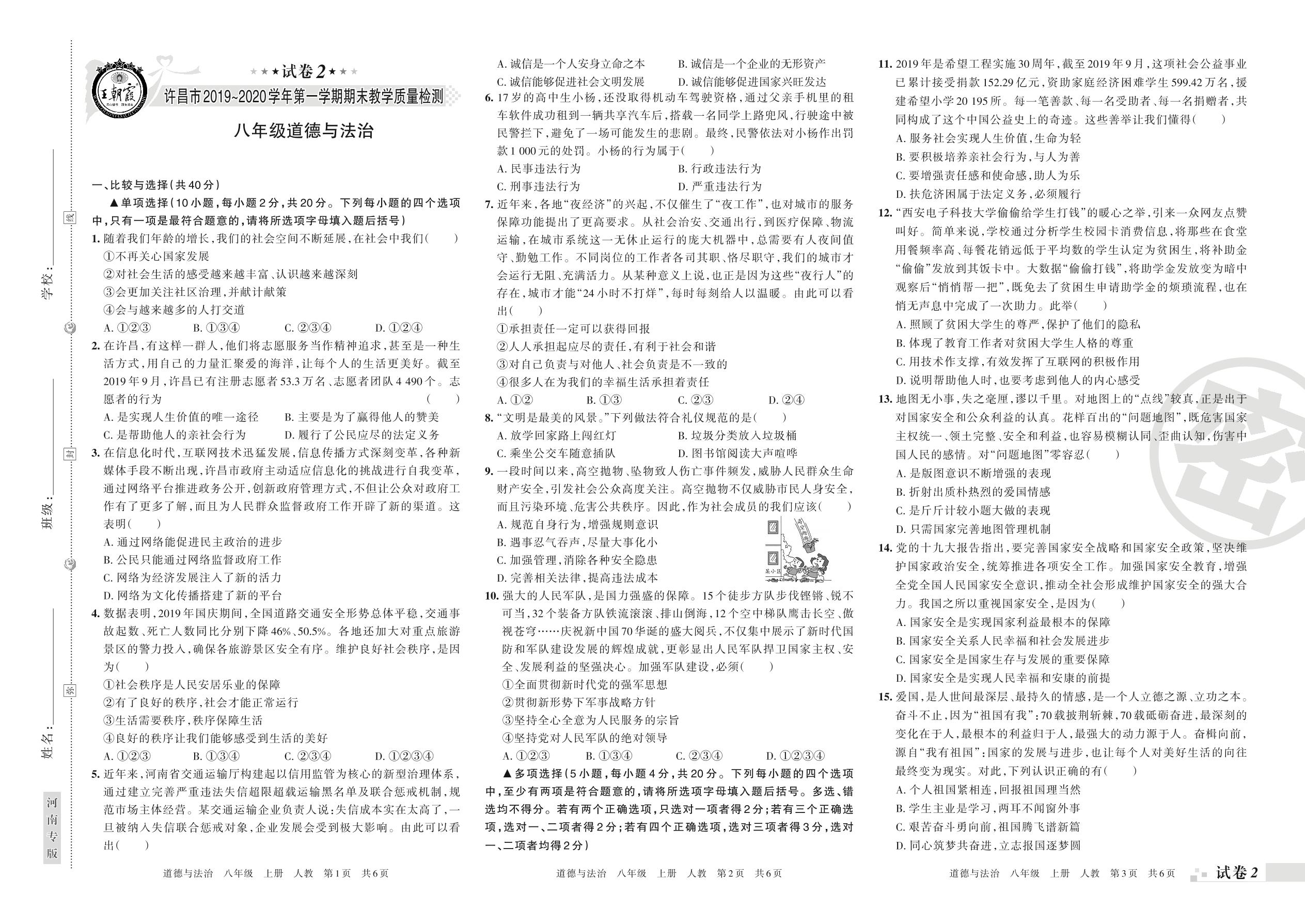 2019-2020学年第一学期许昌市八年级道德与法治试卷(人教版)【2】
