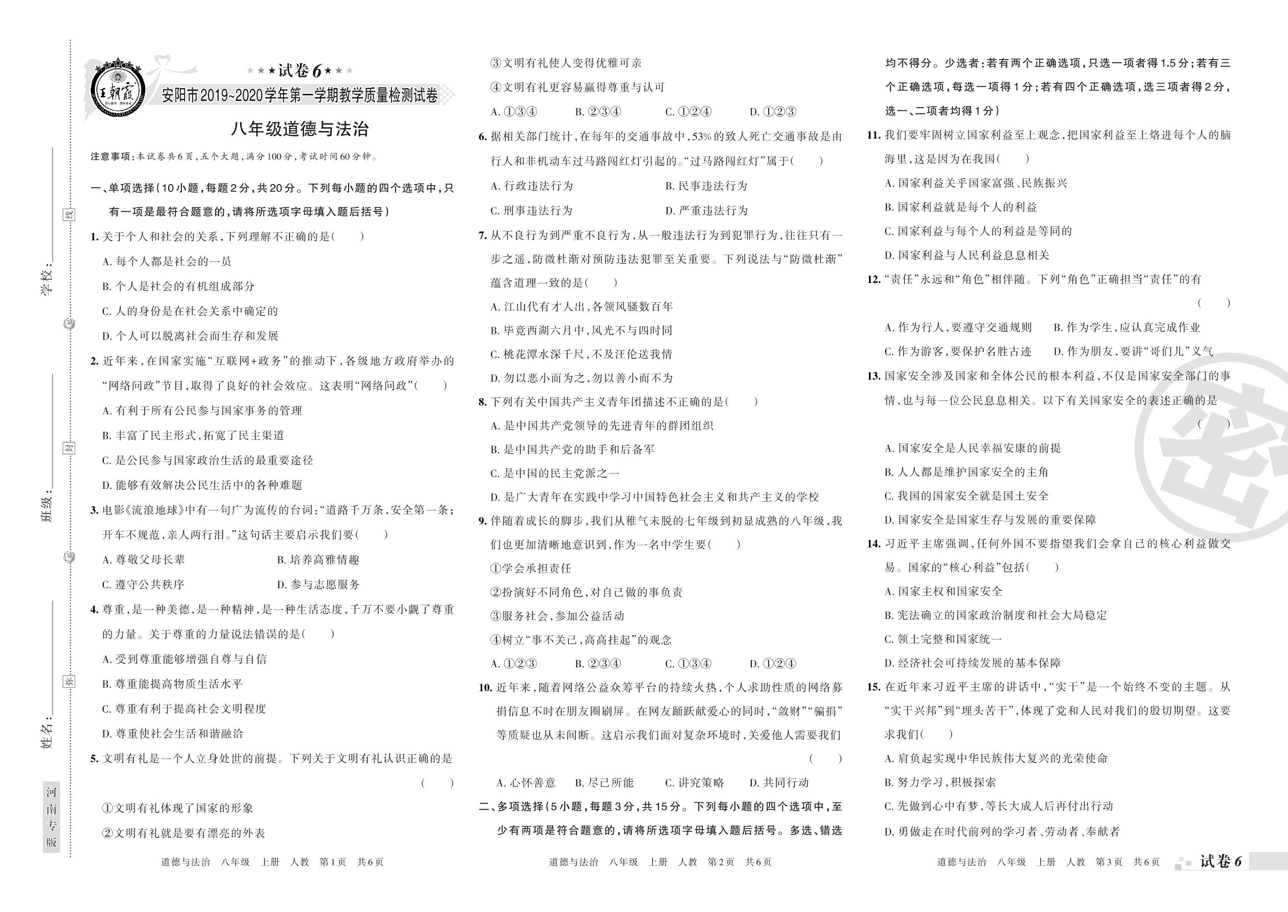 2019-2020学年第一学期安阳市八年级道德与法治试卷(人教版)【6】