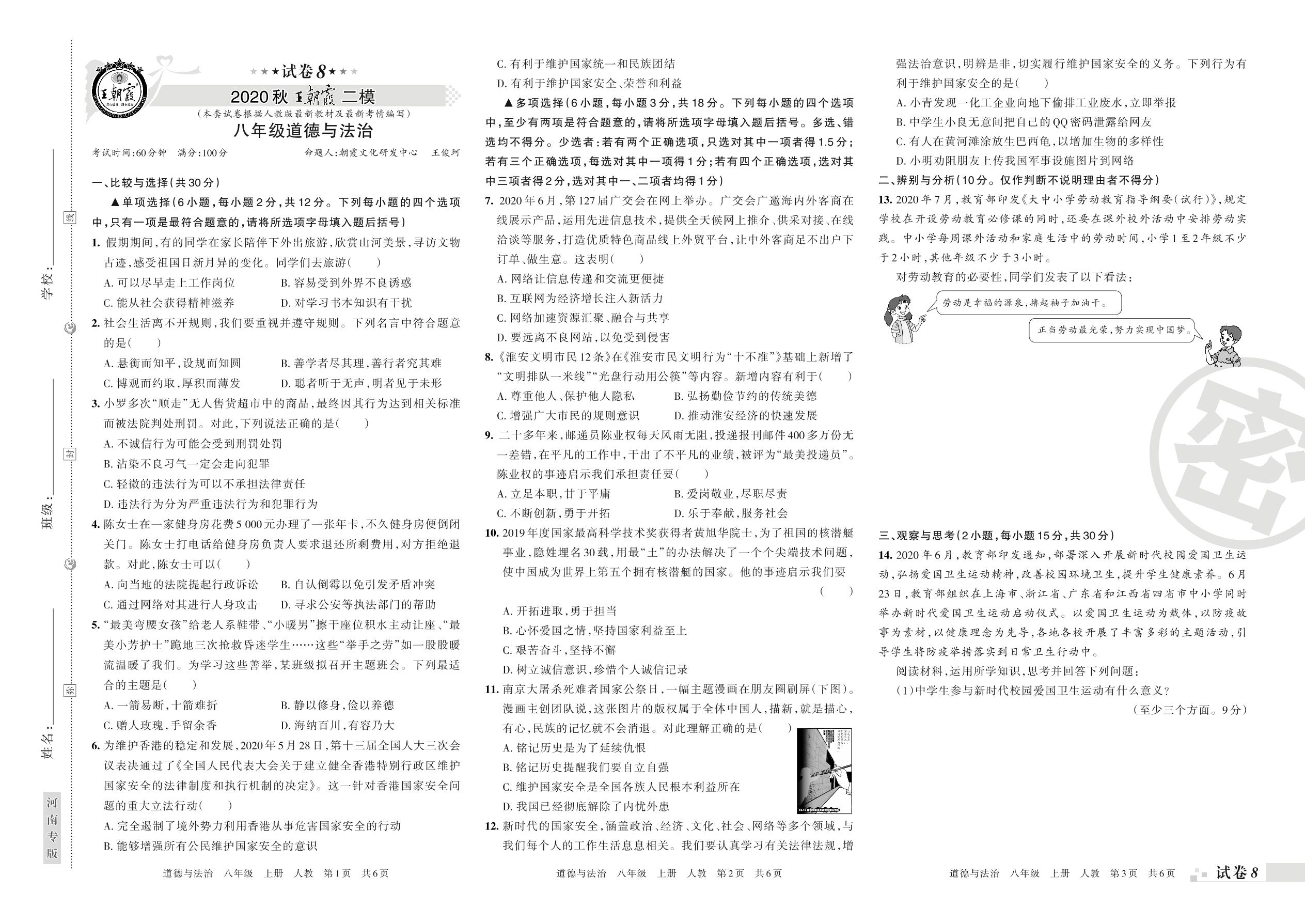 王朝霞期末模拟卷八年级上册道德与法治(人教版)_R210812140505【8】