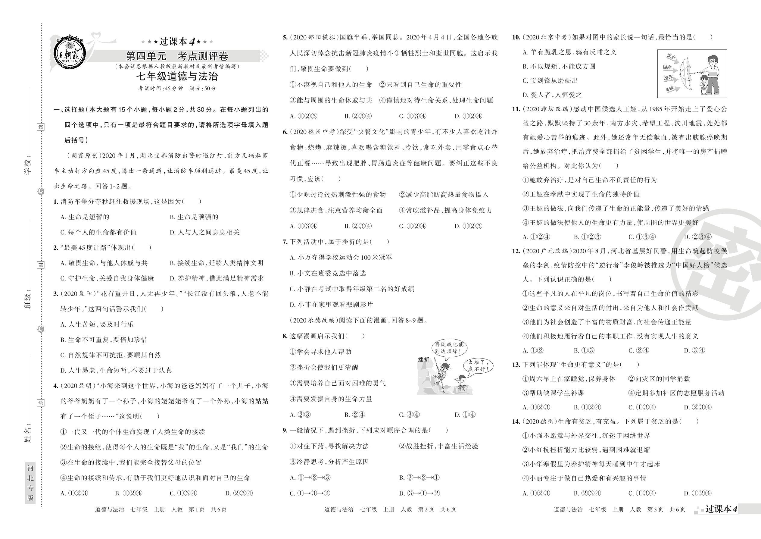 王朝霞期末过课本——第四单元考点测评七年级上册道德与法治(人教版)【0】