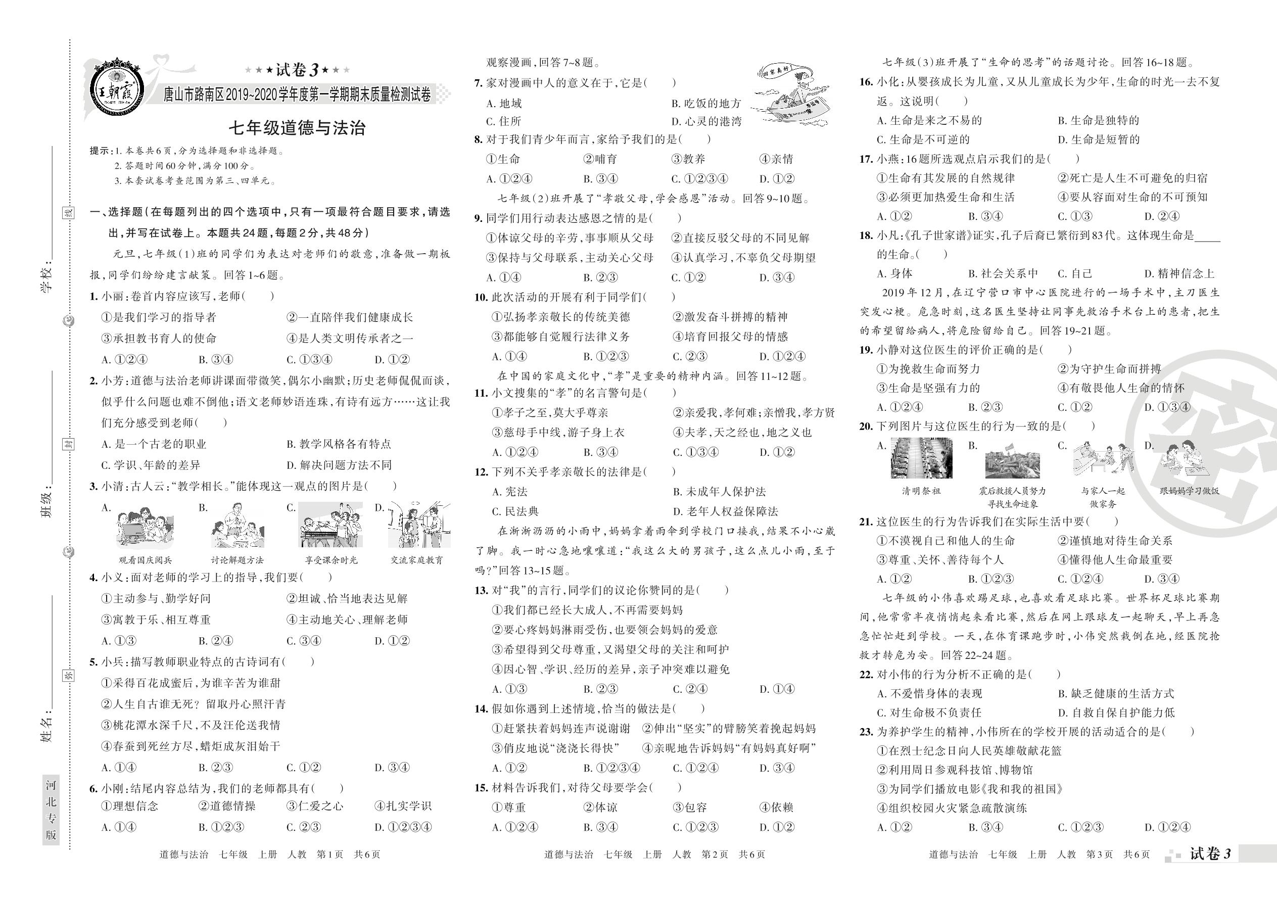 2019-2020学年第一学期唐山市路南区七年级道德与法治试卷(人教版)【3】