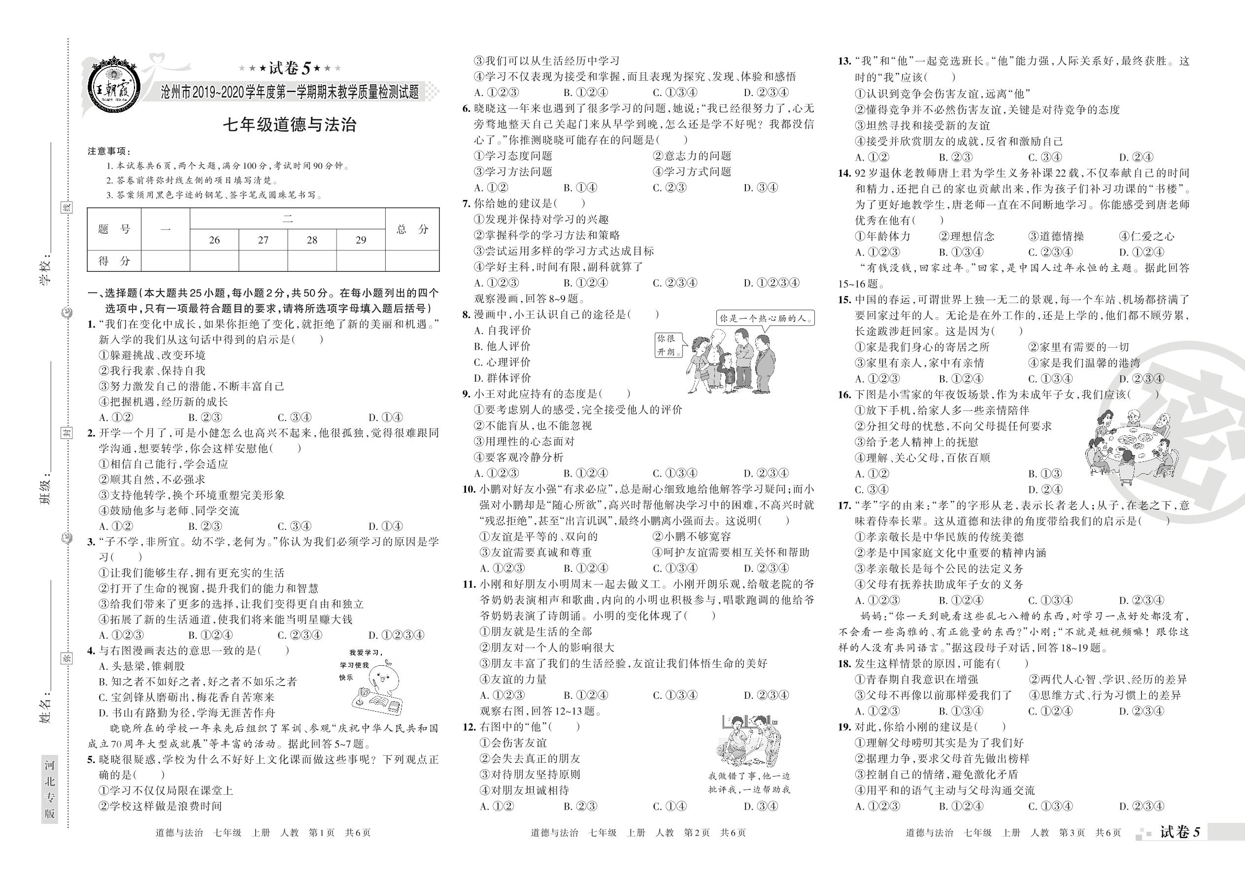 2019-2020学年第一学期沧州市七年级道德与法治试卷(人教版)【5】