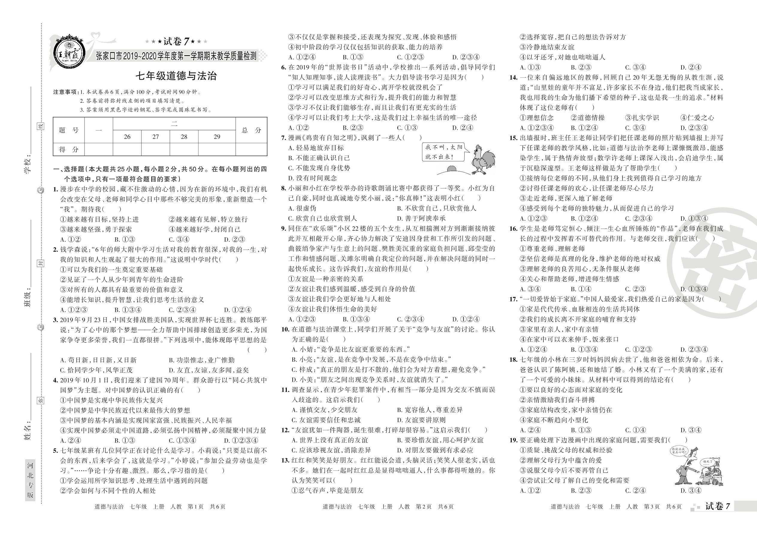 2019-2020学年第一学期张家口市七年级道德与法治试卷(人教版)【7】