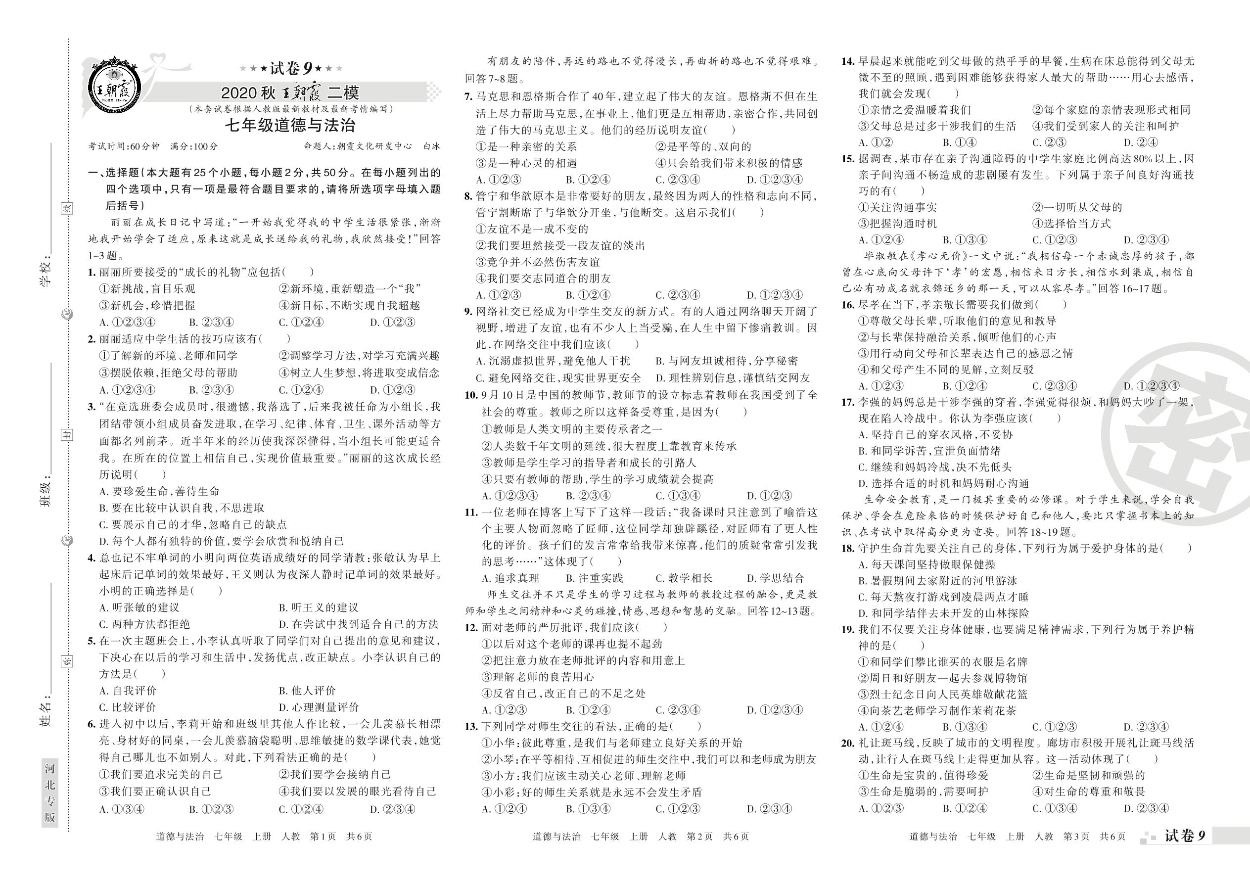 王朝霞期末模拟卷七年级上册道德与法治(人教版)_R210812140715【9】
