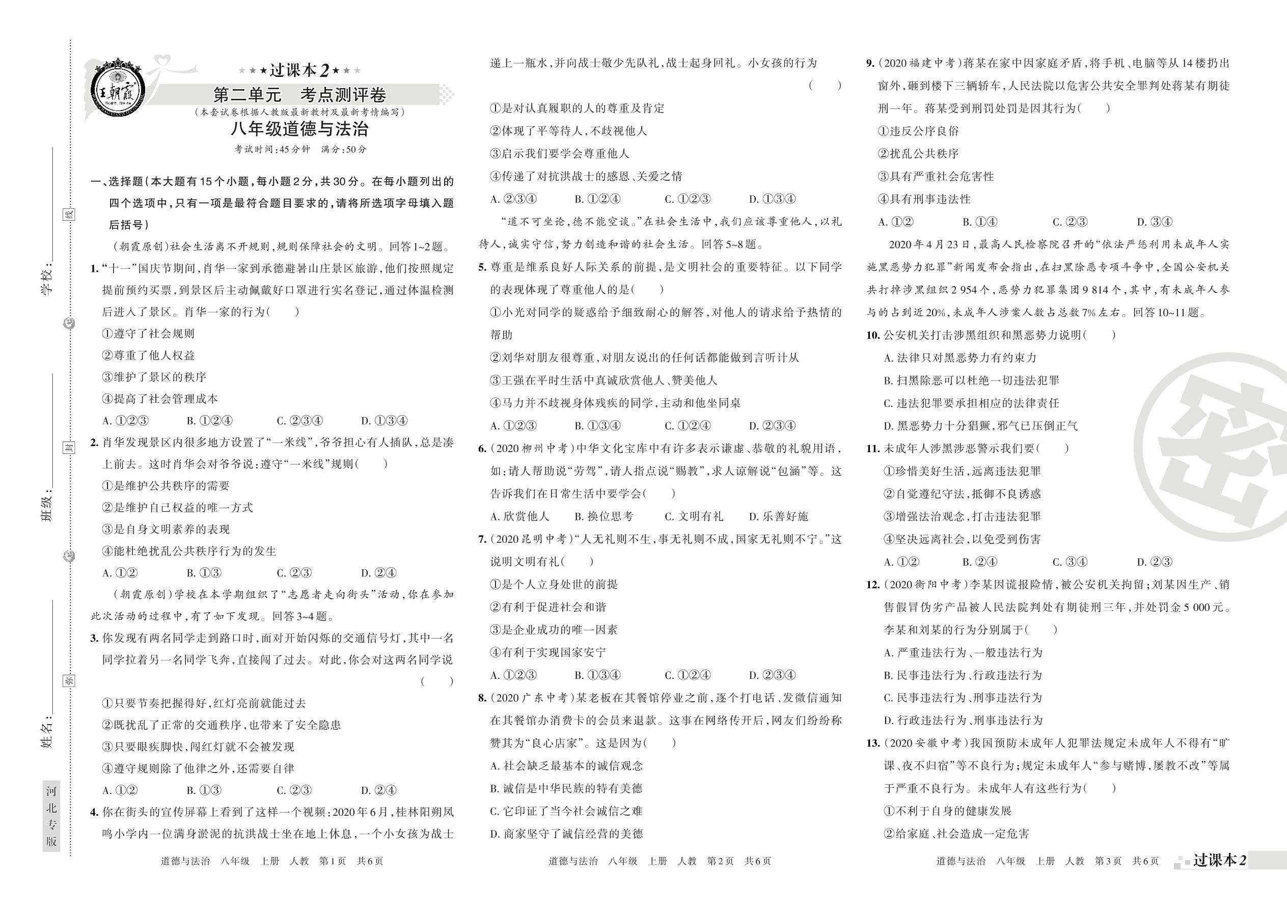 王朝霞期末过课本——第二单元考点测评八年级上册道德与法治(人教版)【0】