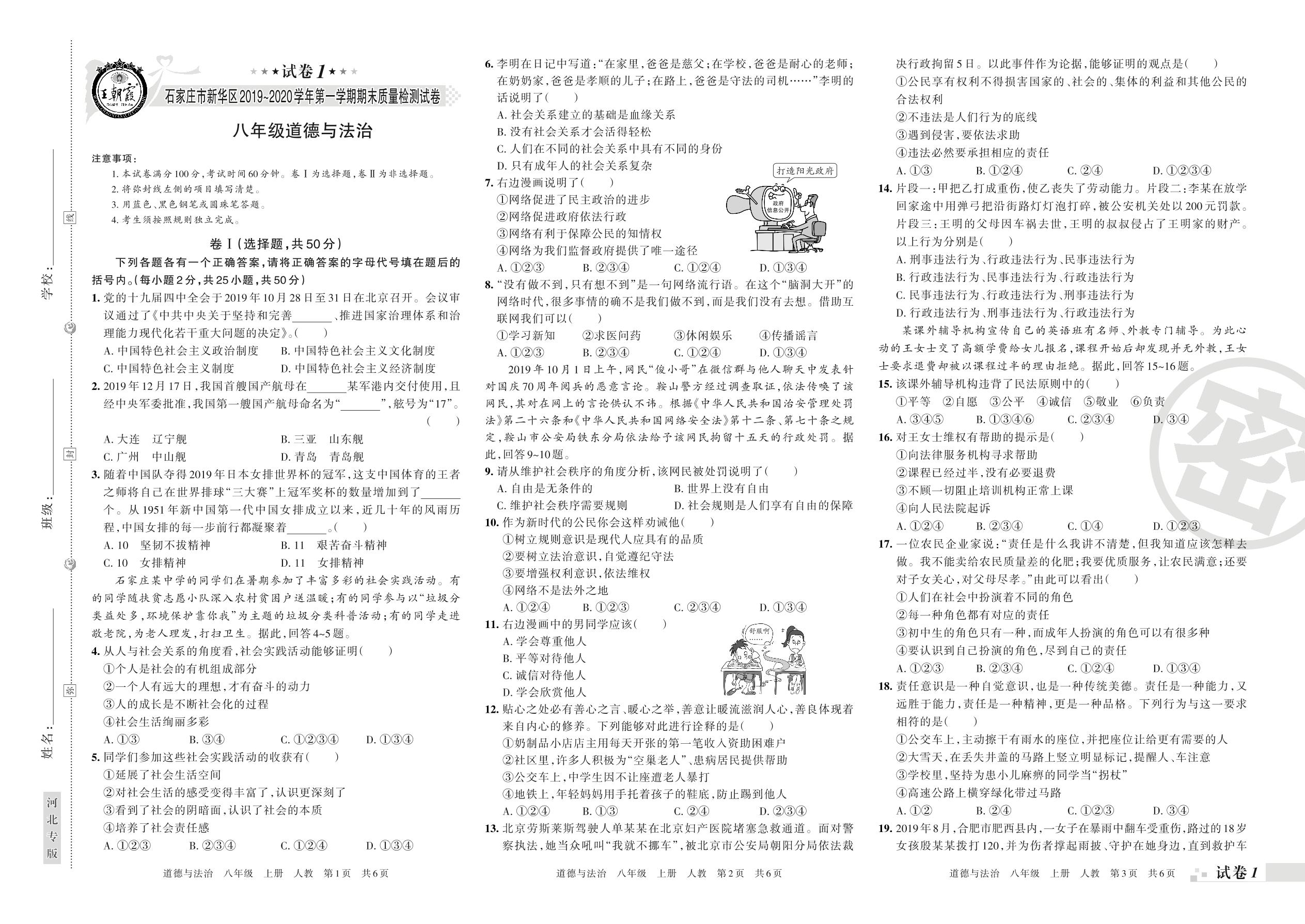 2019-2020学年第一学期石家庄市新华区八年级道德与法治试卷(人教版)【1】