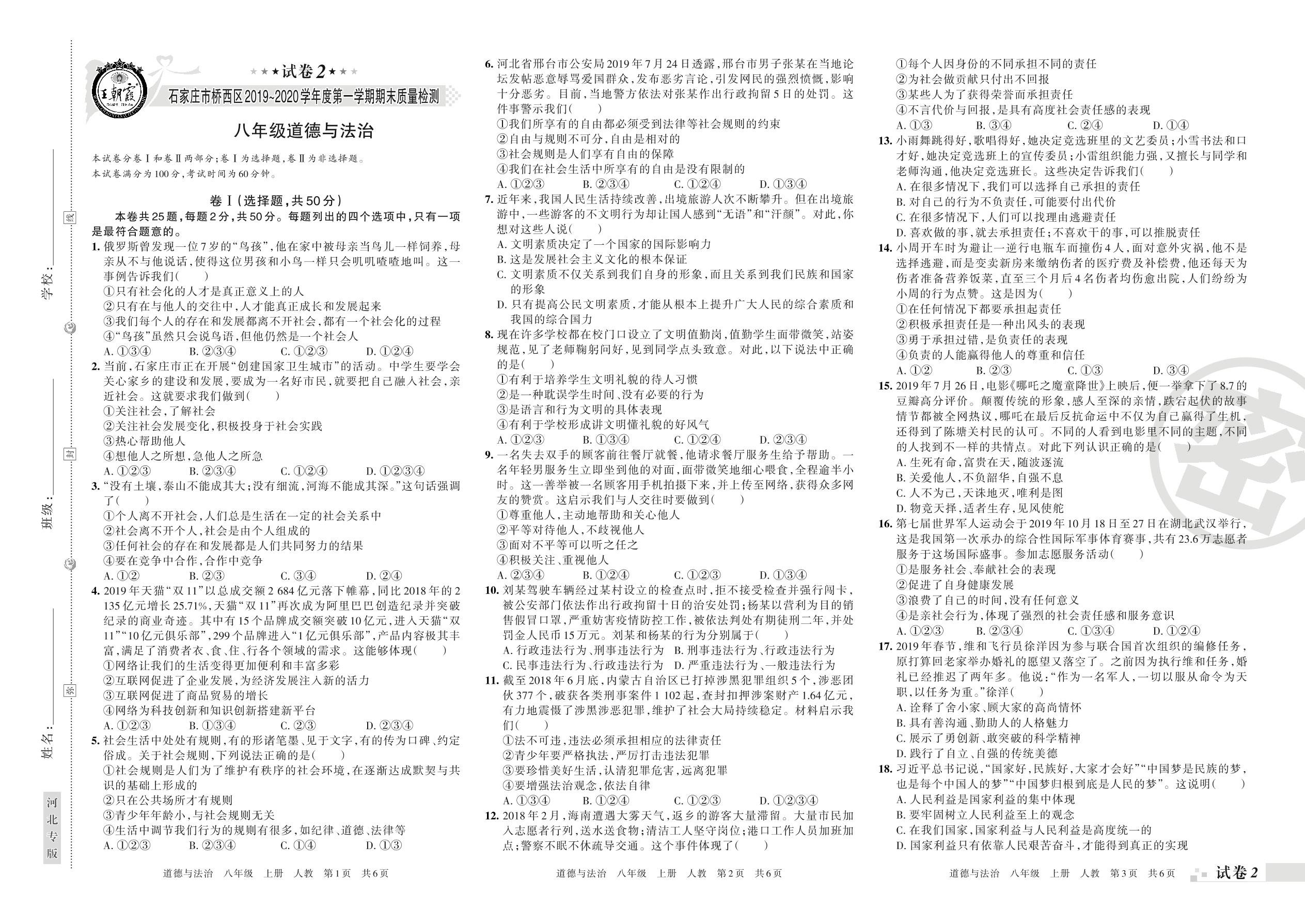 2019-2020学年第一学期石家庄市桥西区八年级道德与法治试卷(人教版)【2】
