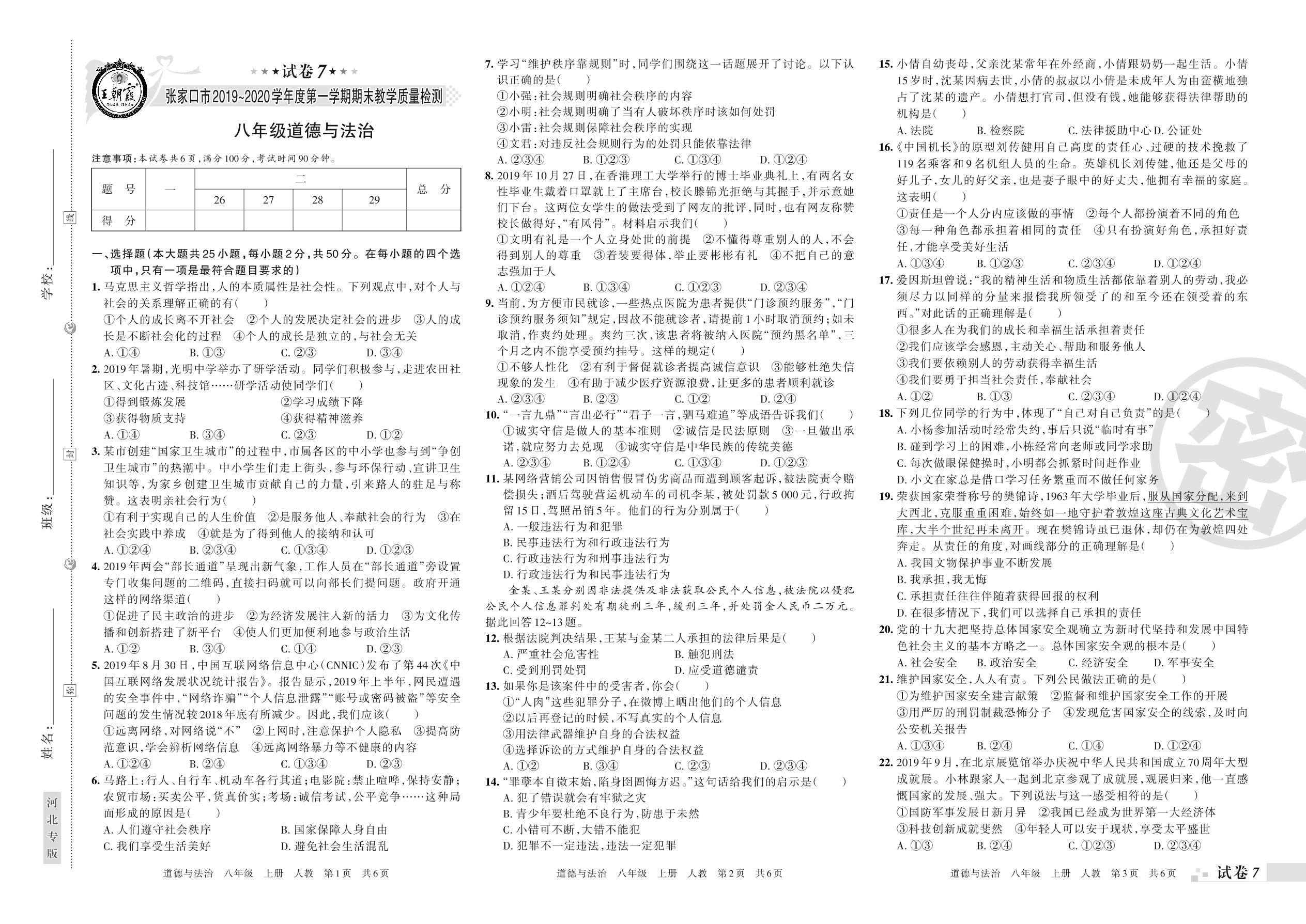 2019-2020学年第一学期张家口市八年级道德与法治试卷(人教版)【7】