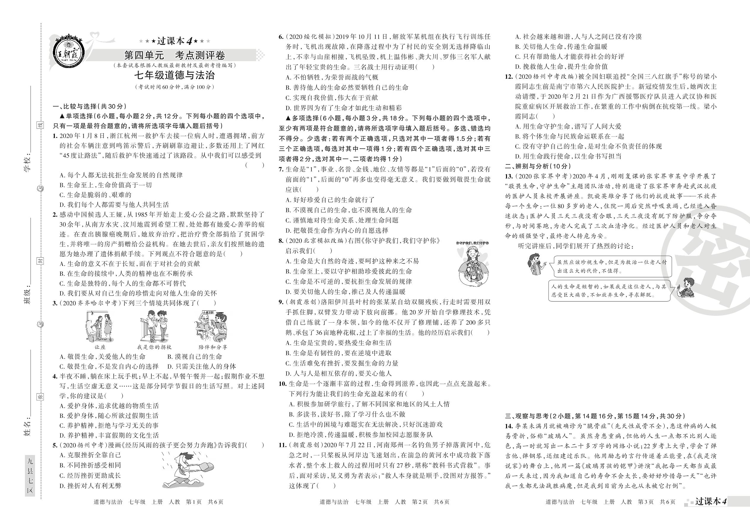 王朝霞期末过课本——第四单元考点测评七年级上册道德与法治(人教版)_R210812140951【0】