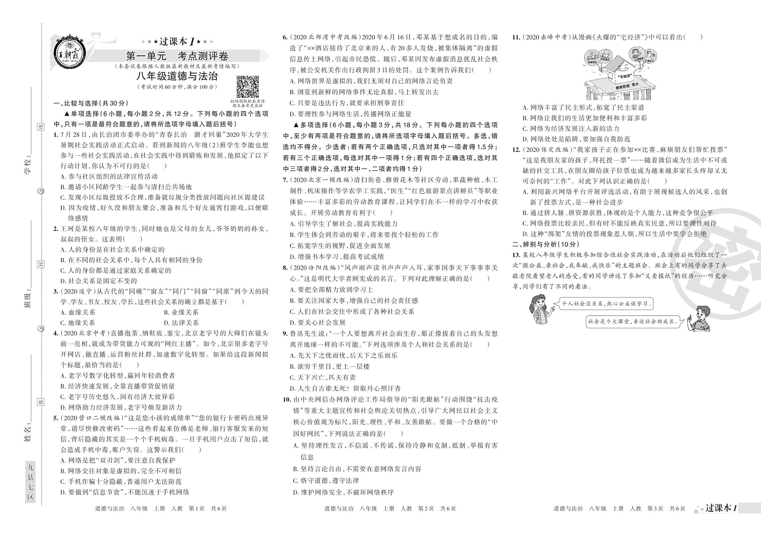 王朝霞期末过课本——第一单元考点测评八年级上册道德与法治(人教版)_R210812141156【0】