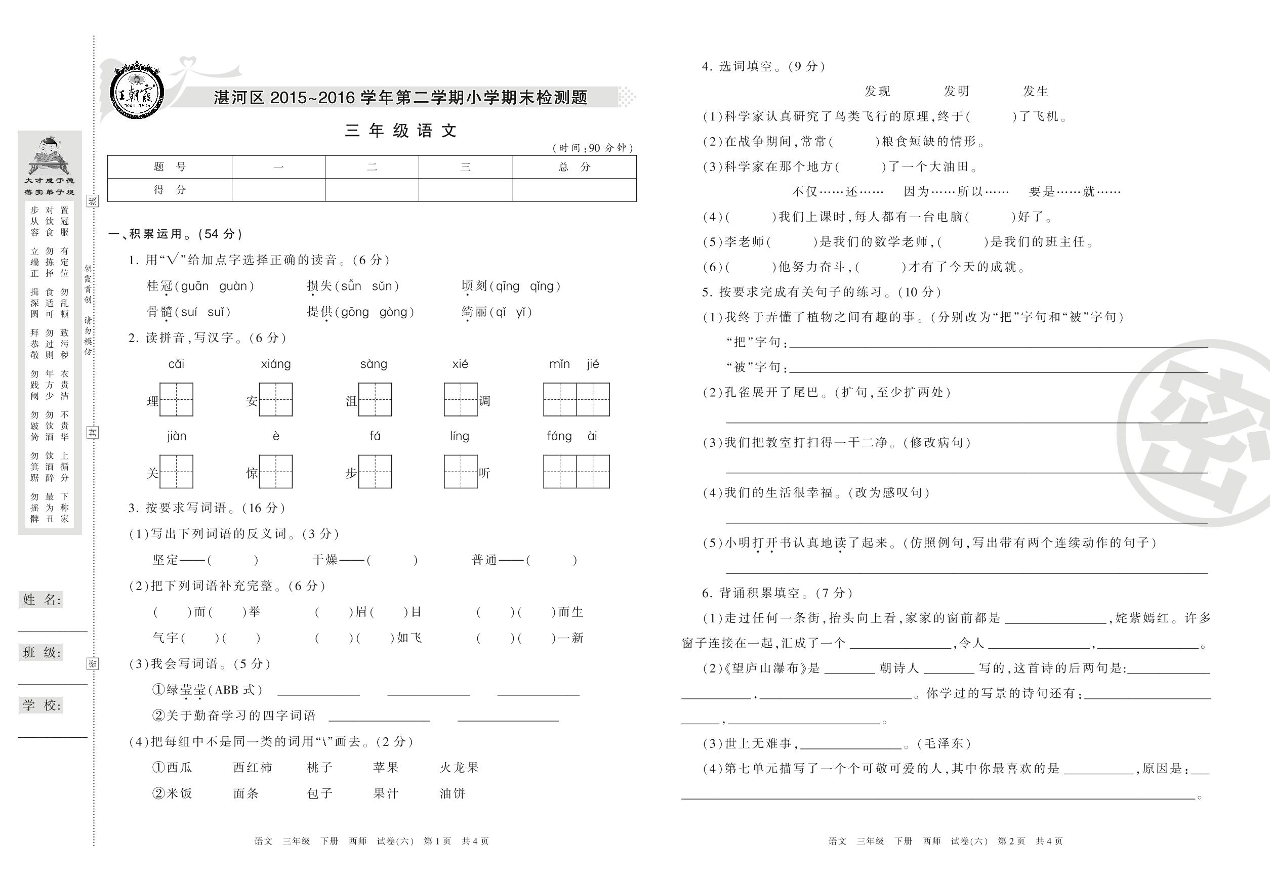 2015-2016学年第二学期平顶山市湛河区三年级语文试卷(西师版)【6】