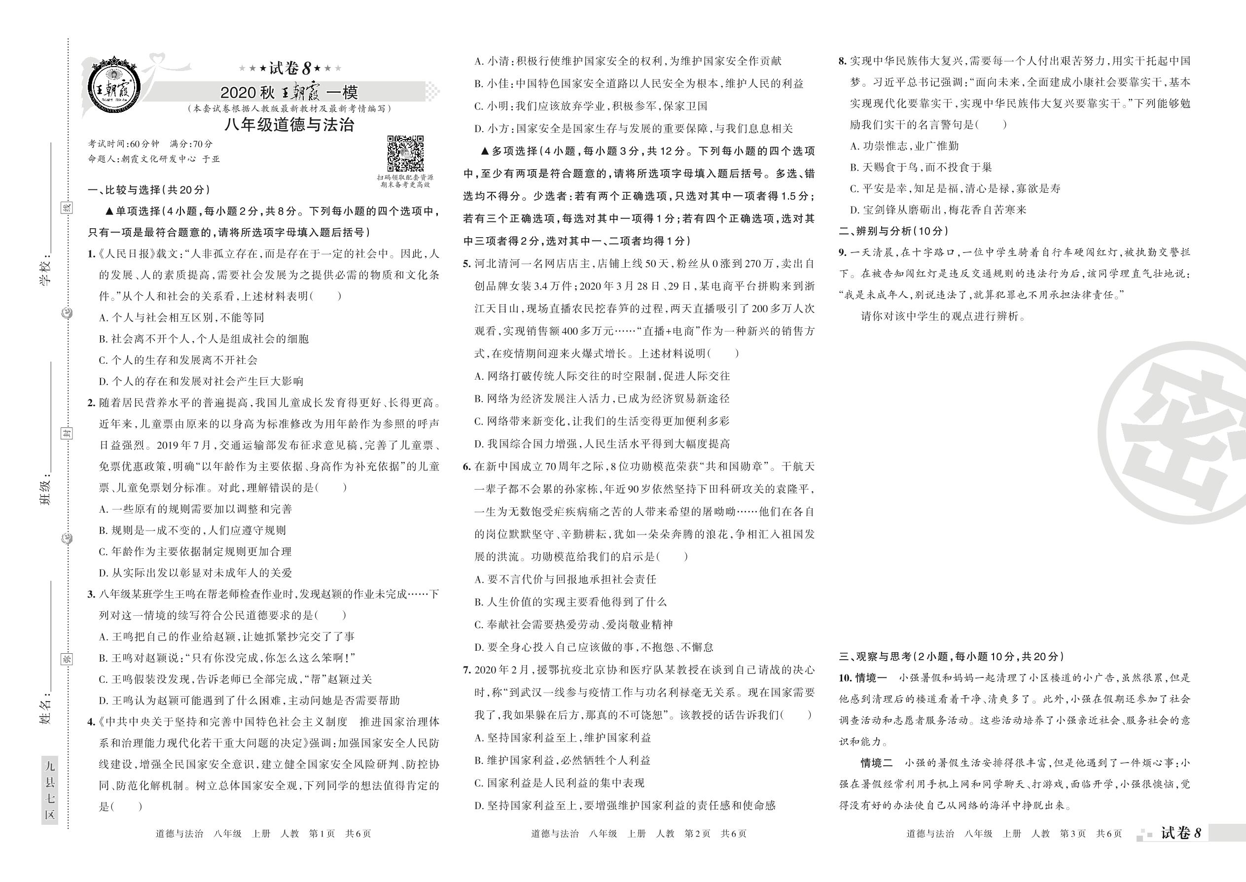王朝霞期末模拟卷八年级上册道德与法治(人教版)【8】