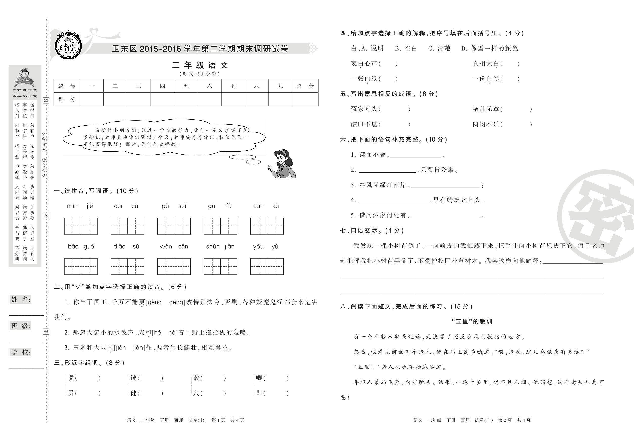 2015-2016学年第二学期卫东市三年级语文试卷(西师版)【7】