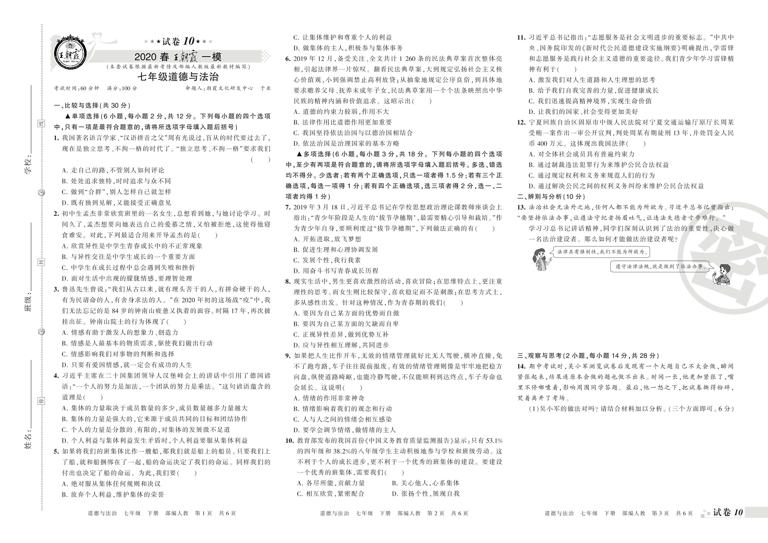 王朝霞期末模拟卷七年级下册道德与法治(人教版)【10】