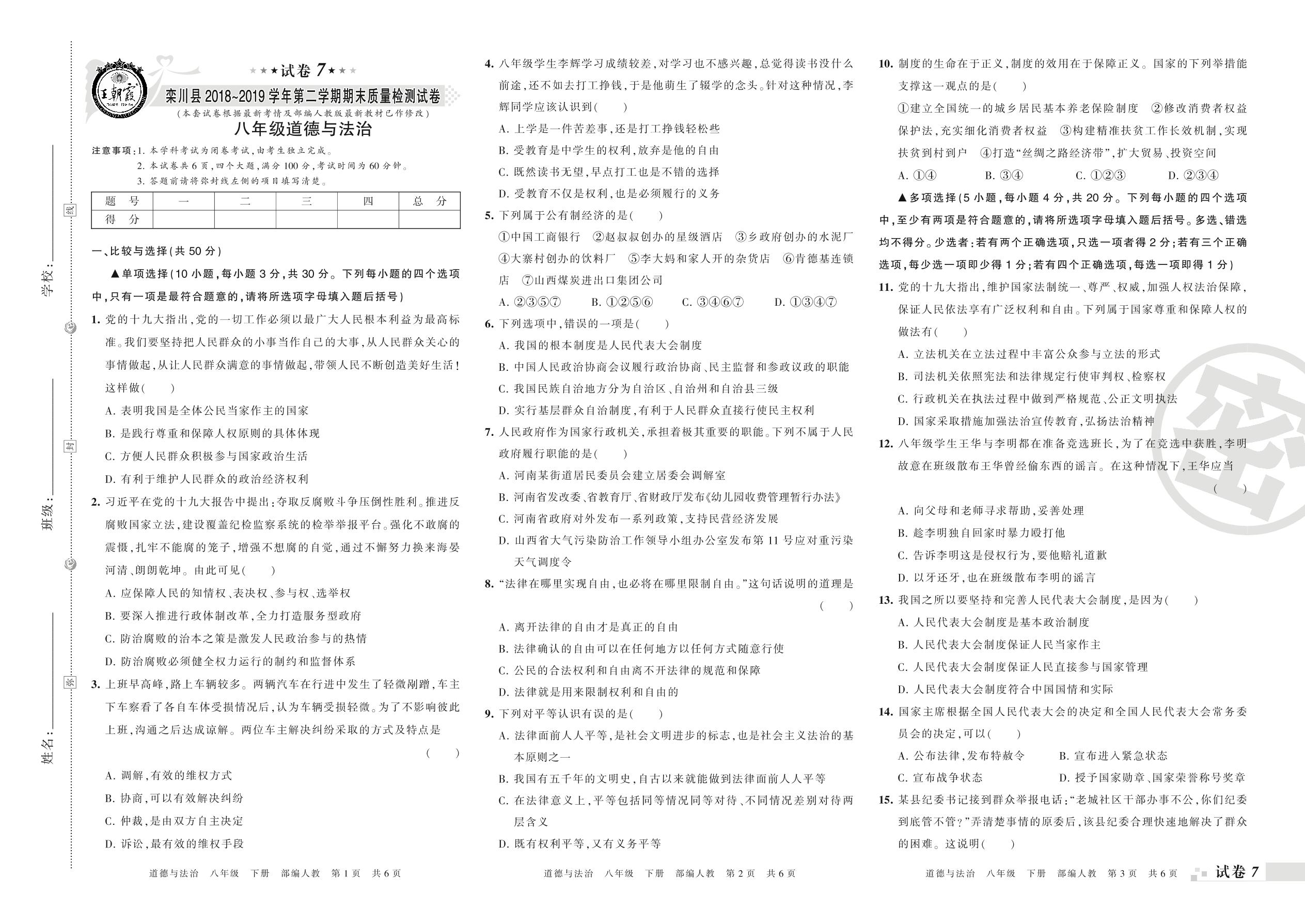 2018-2019学年第二学期洛阳市栾川县八年级道德与法治试卷(人教版)【7】