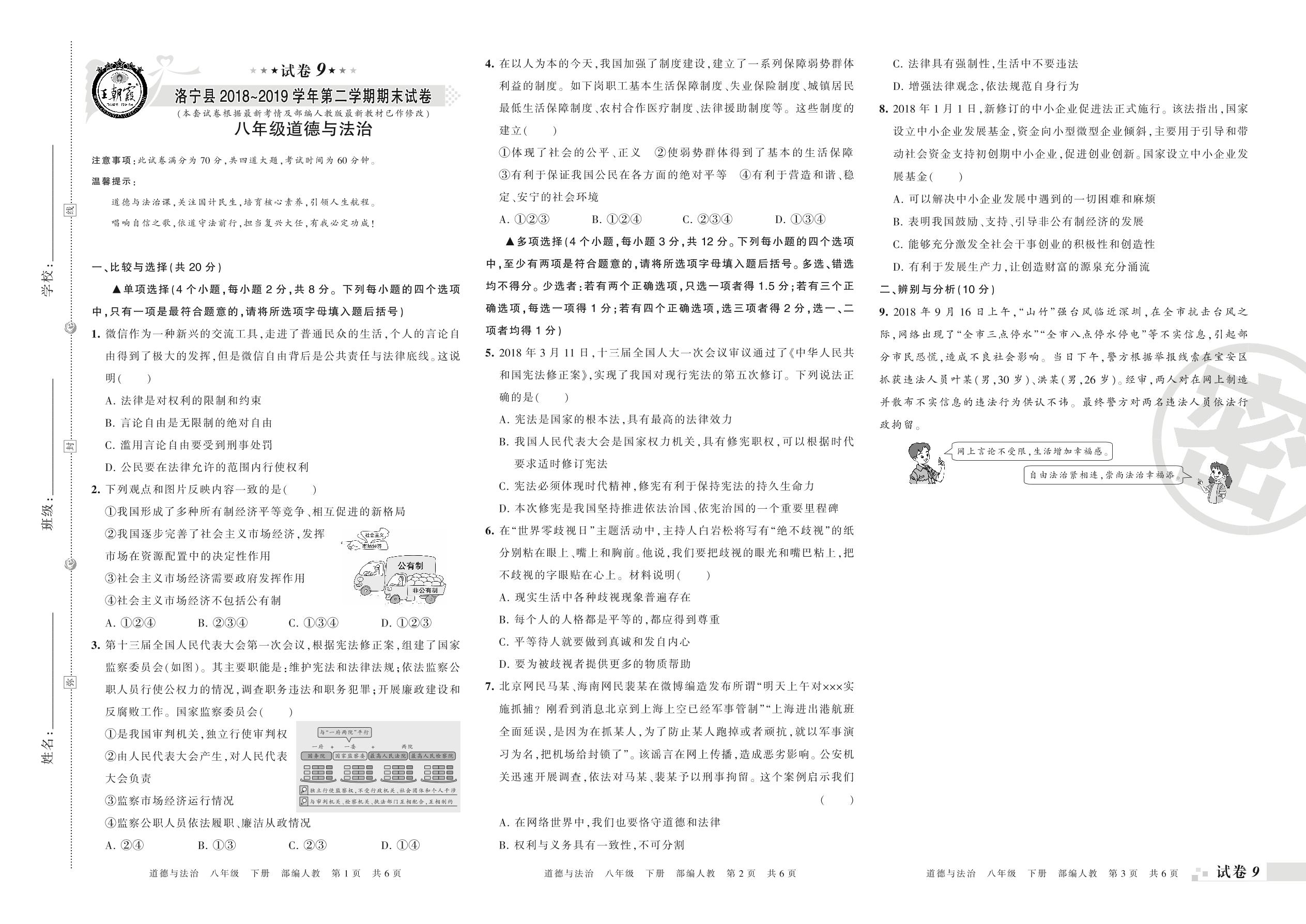 2018-2019学年第二学期洛阳市洛宁县八年级道德与法治试卷(人教版)【9】