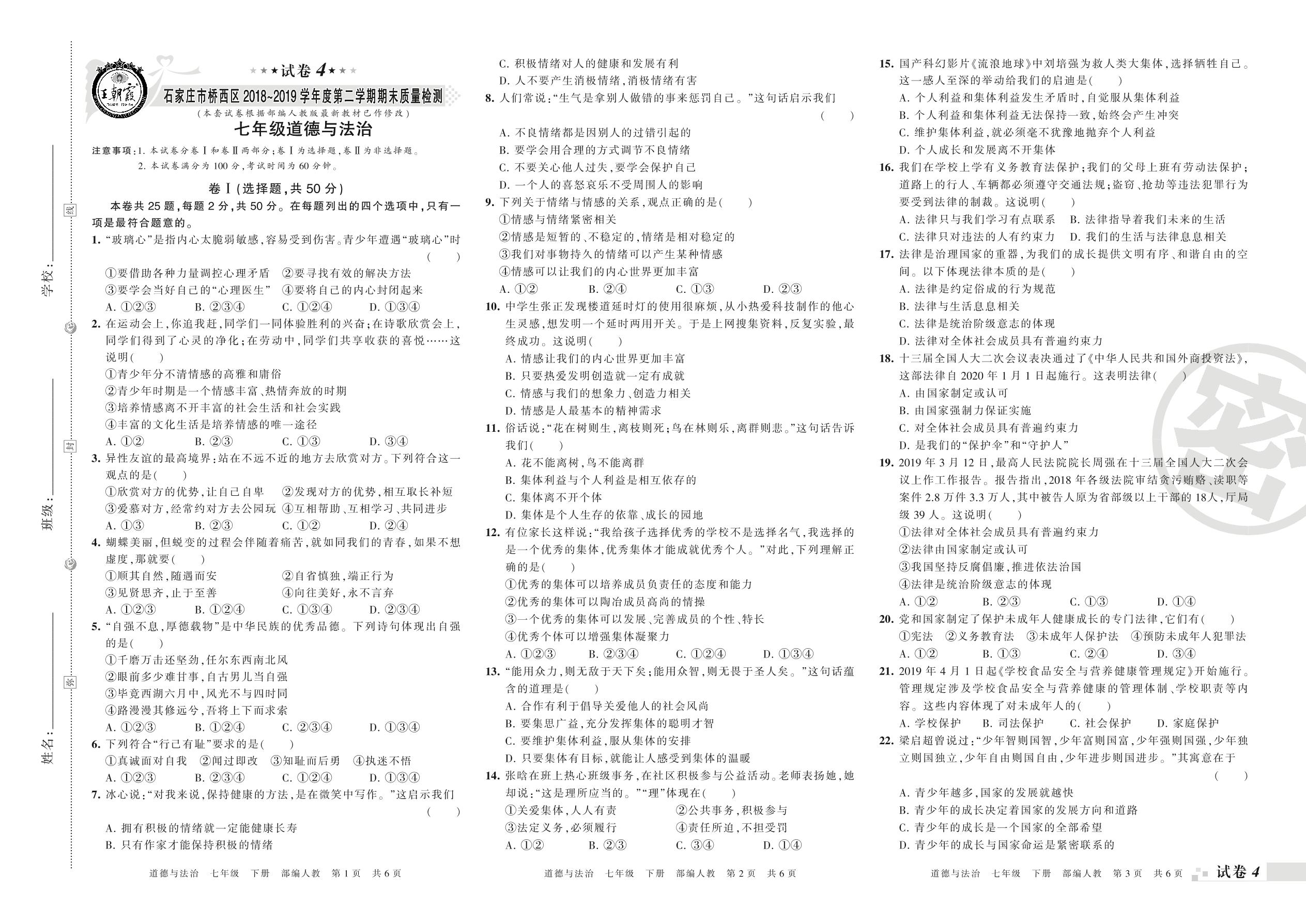 2018-2019学年第二学期石家庄市石家庄桥西区七年级道德与法治试卷(人教版)【4】