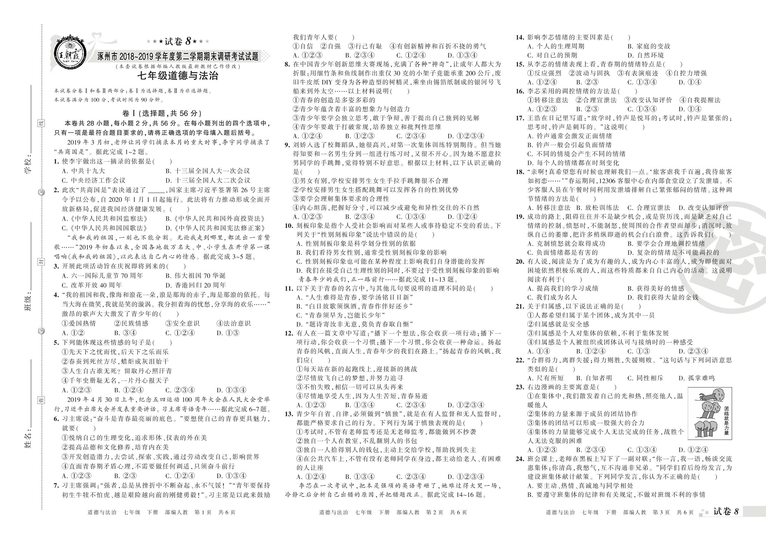 2018-2019学年第二学期涿州市七年级道德与法治试卷(人教版)【8】