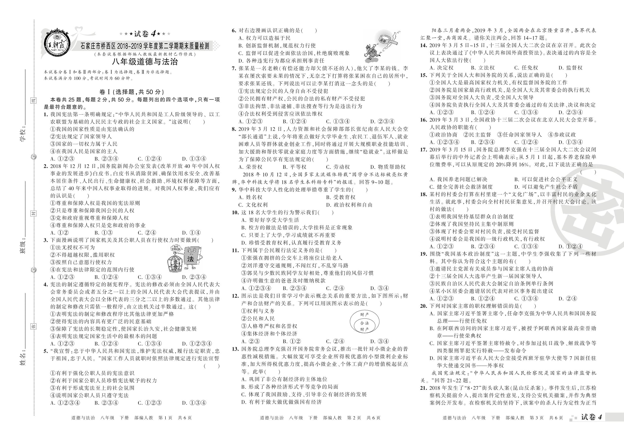 2018-2019学年第二学期石家庄市石家庄桥西区八年级道德与法治试卷(人教版)【4】