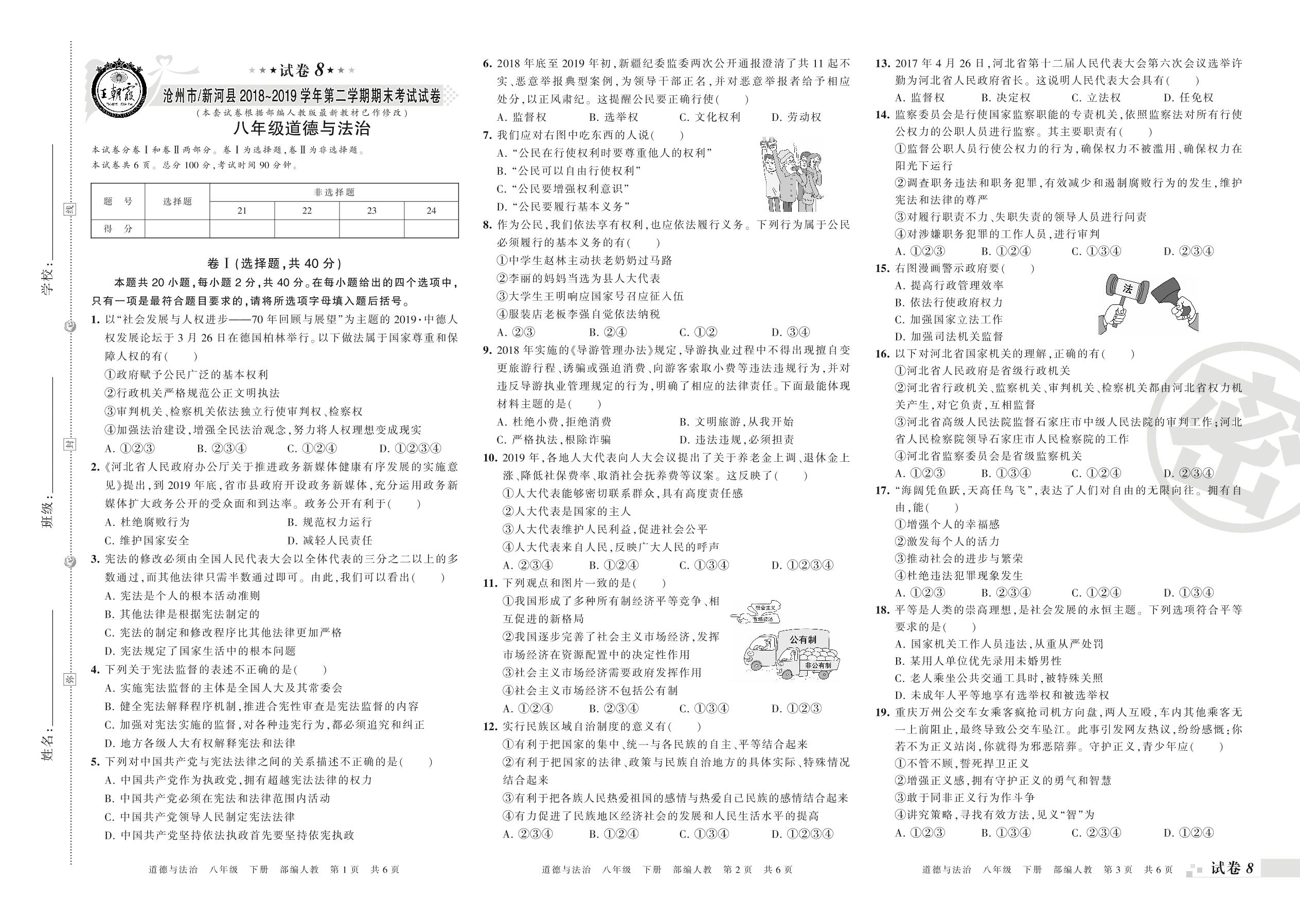 2018-2019学年第二学期沧州市、新河县八年级道德与法治试卷(人教版)【8】