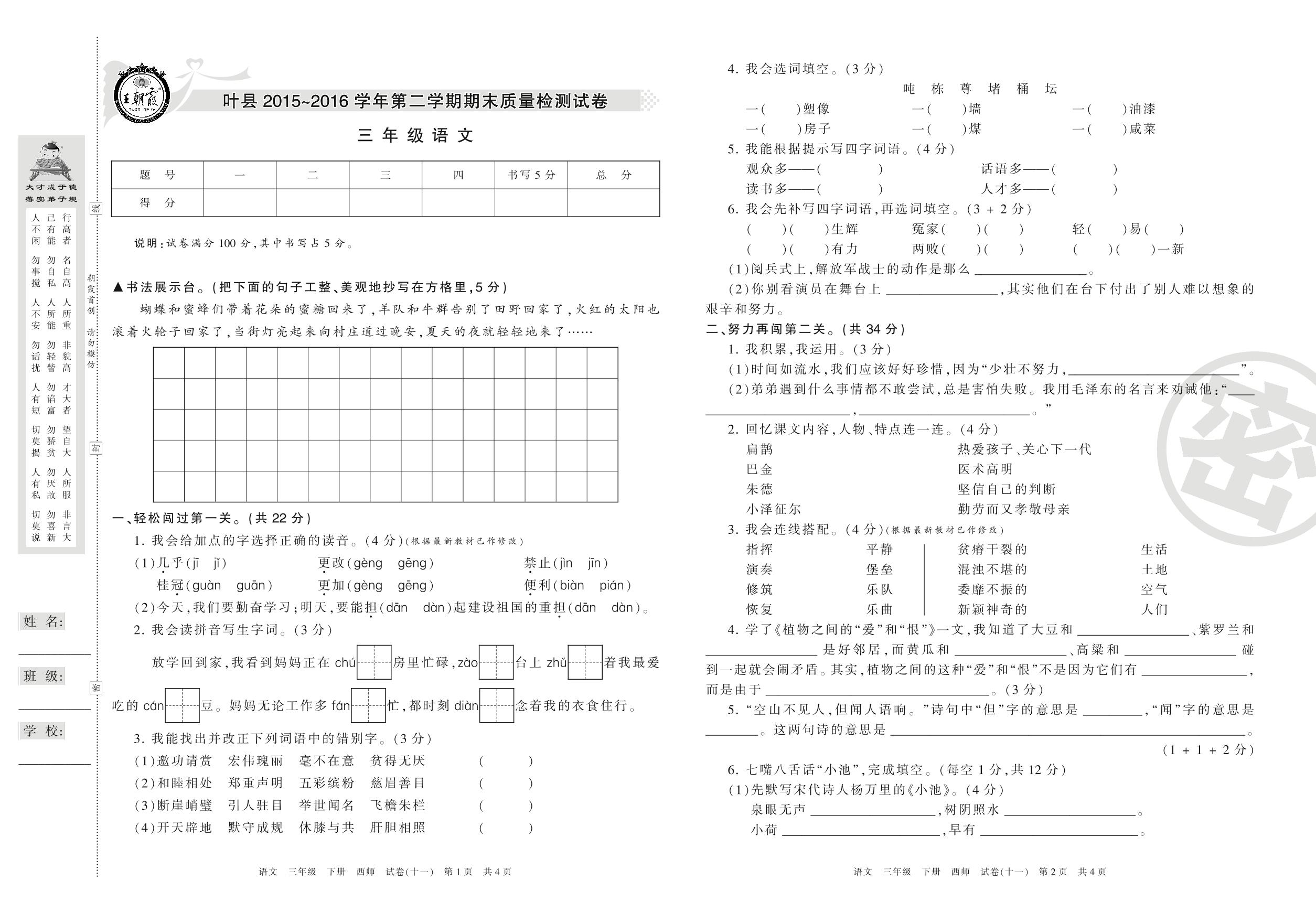 2015-2016学年第二学期平顶山市叶县三年级语文试卷(西师版)【11】