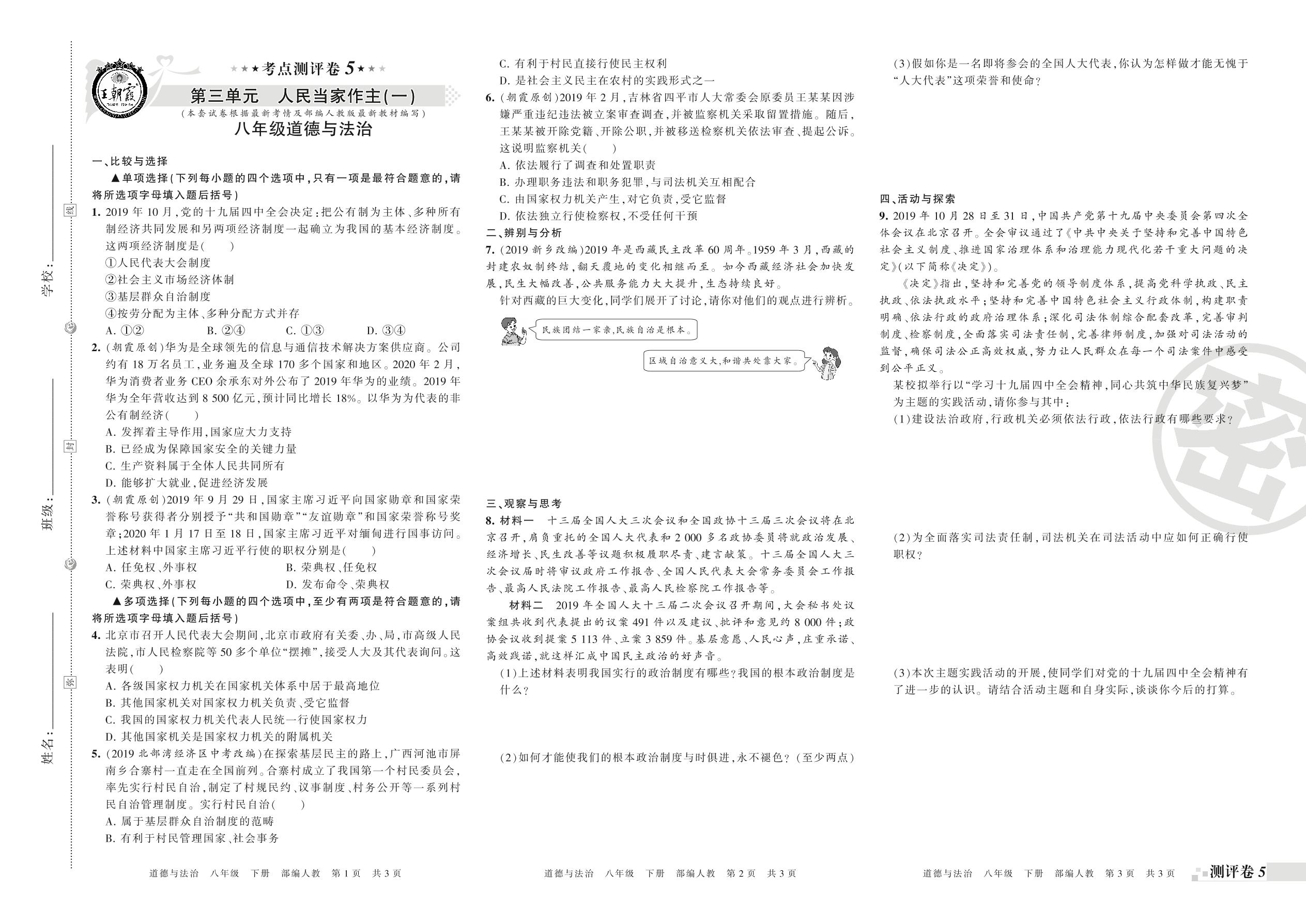 王朝霞期末测评卷——第三单元 人民当家作主(一)(二)八年级下册道德与法治(人教版)【0】