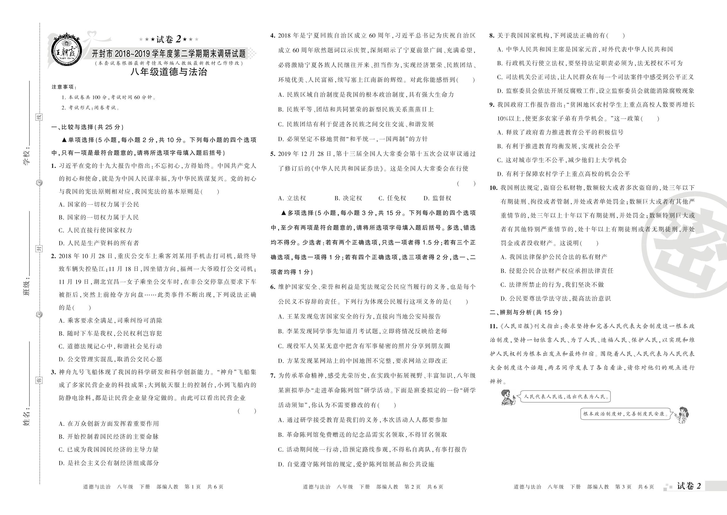 2018-2019学年第二学期开封市八年级道德与法治试卷(人教版)【2】