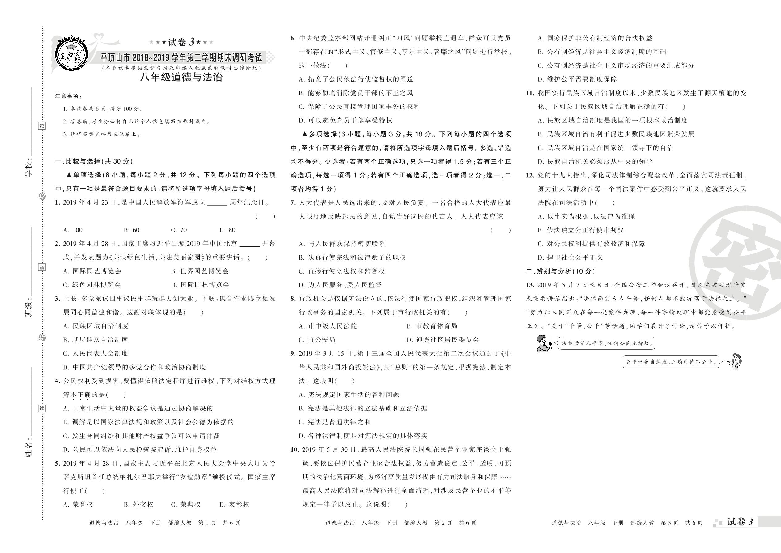 2018-2019学年第二学期平顶山市八年级道德与法治试卷(人教版)【3】