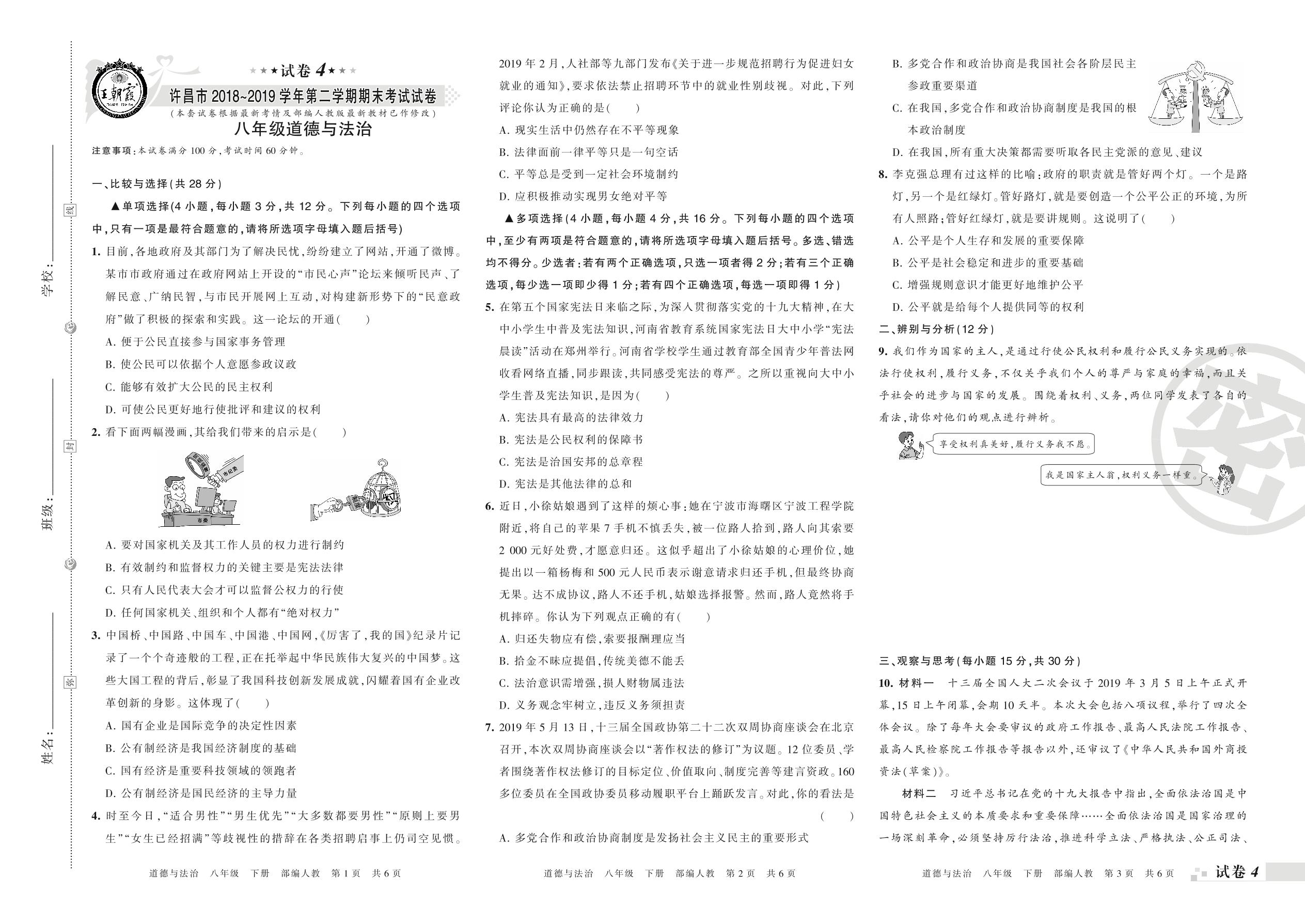 2018-2019学年第二学期许昌市八年级道德与法治试卷(人教版)【4】
