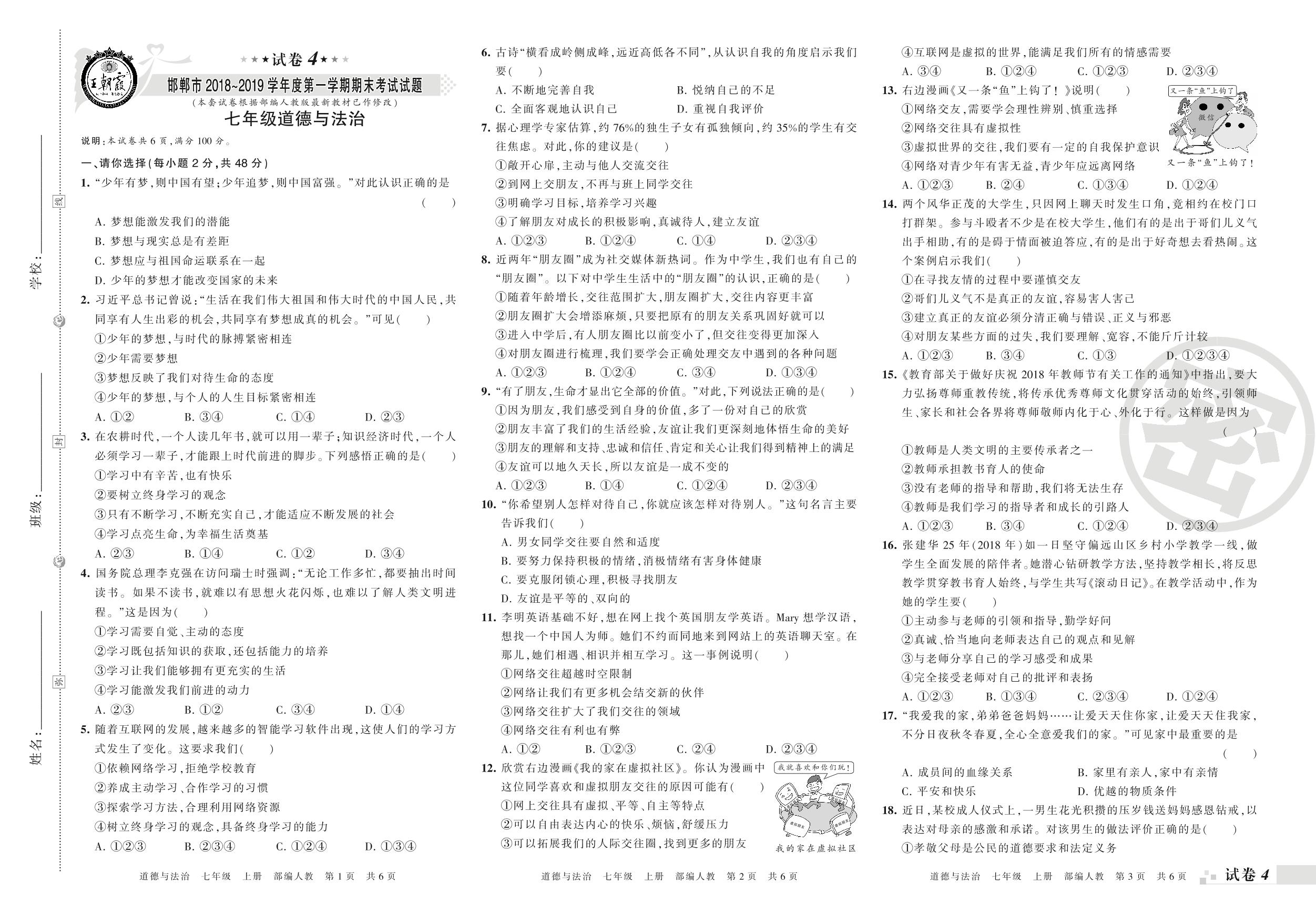 2018-2019学年第一学期邯郸市七年级道德与法治试卷(人教版)【4】