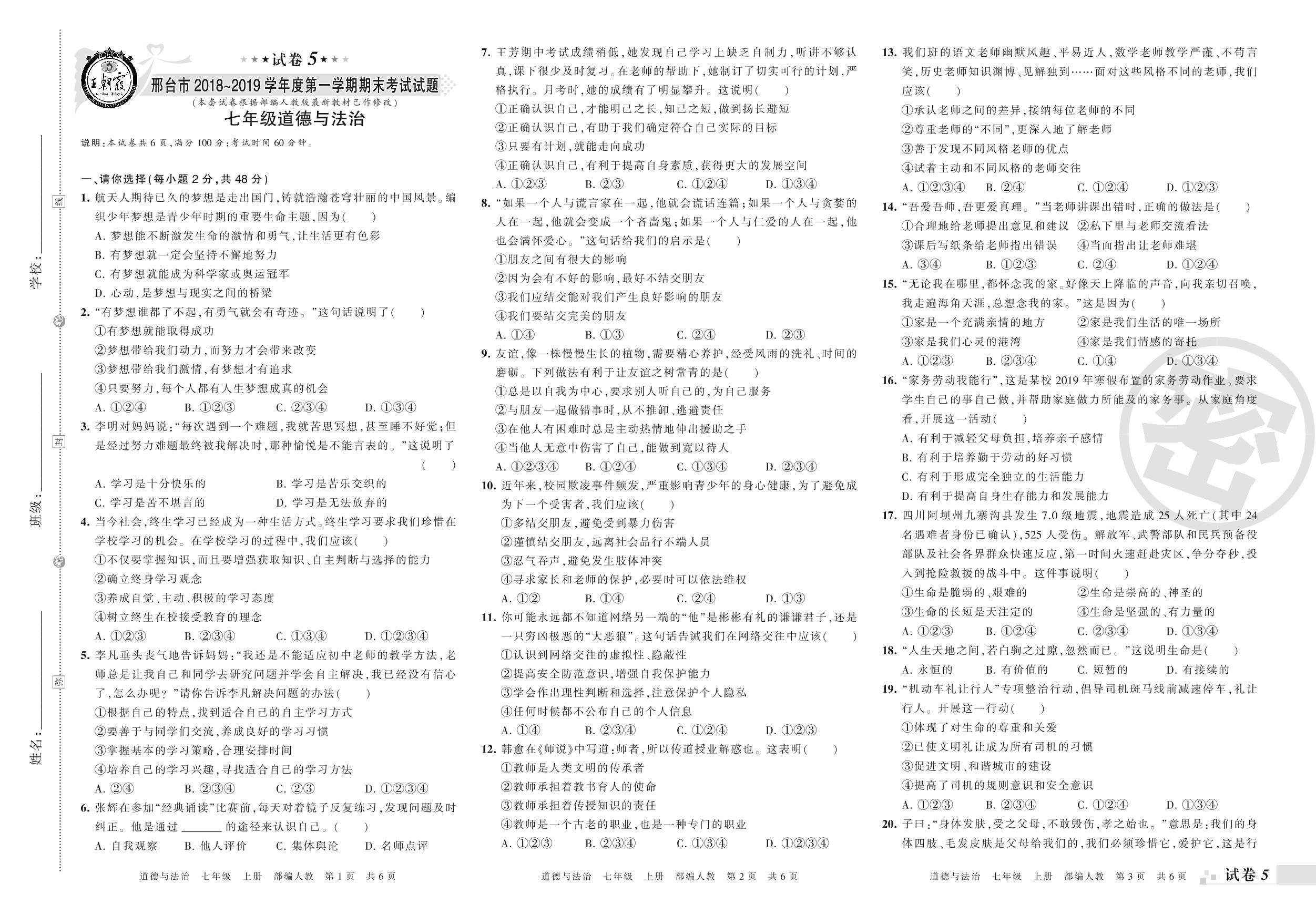 2018-2019学年第一学期邢台市七年级道德与法治试卷(人教版)【5】