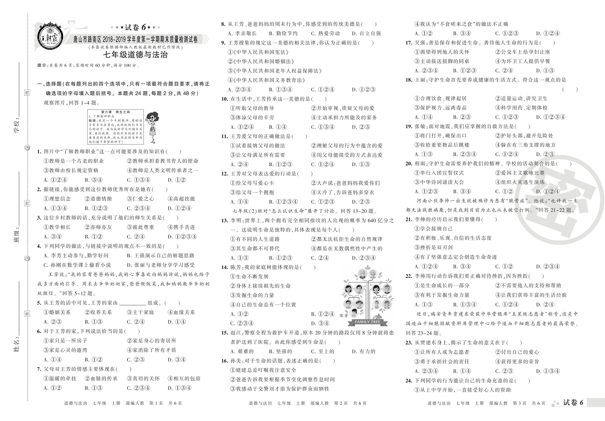 2018-2019学年第一学期唐山市路南区七年级道德与法治试卷(人教版)【6】