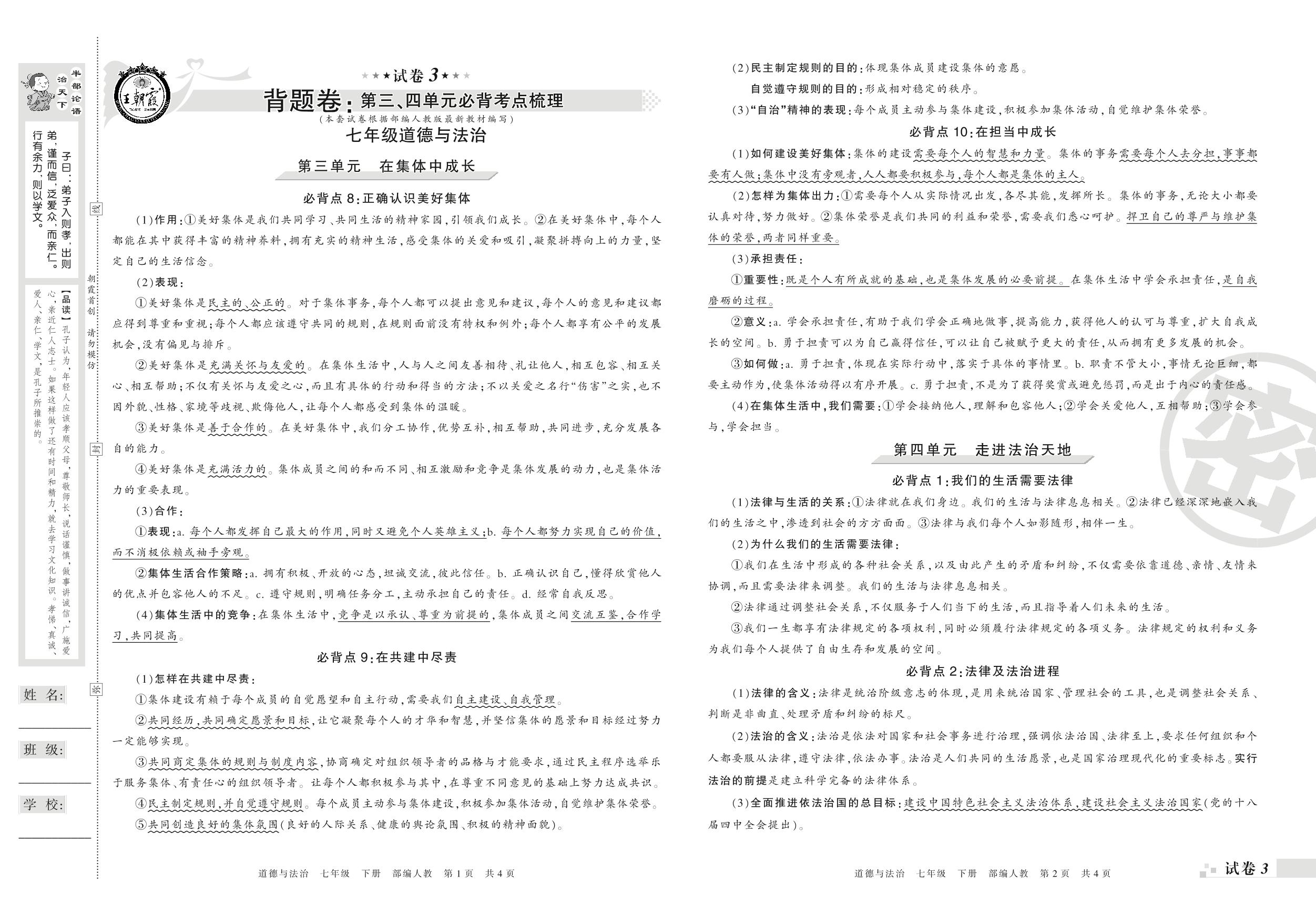 王朝霞期末背题卷——第三、四单元必背考点梳理七年级下册道德与法治(人教版)【3】