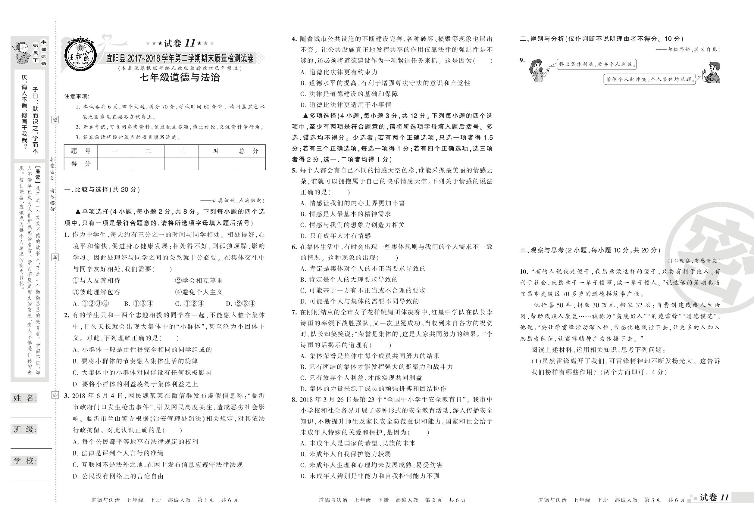 2017-2018学年第二学期洛阳市宜阳县七年级道德与法治试卷(人教版)【11】